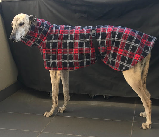 Greyhound coat in deluxe style rug red black tartan check polar fleece washable extra wide neck