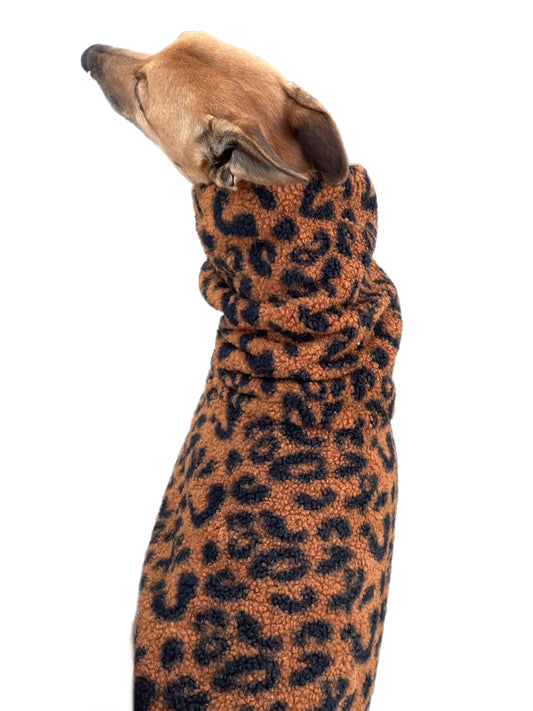 Leopard print Teddy fleece deluxe style greyhound coat with snuggly wide neck roll