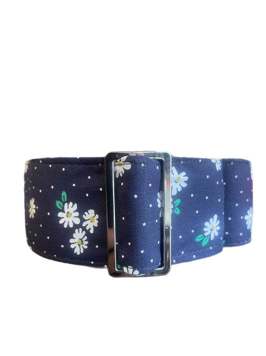 Small white flowers on navy design collar greyhound 5cms cotton fabric covered webbing
