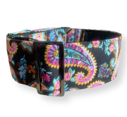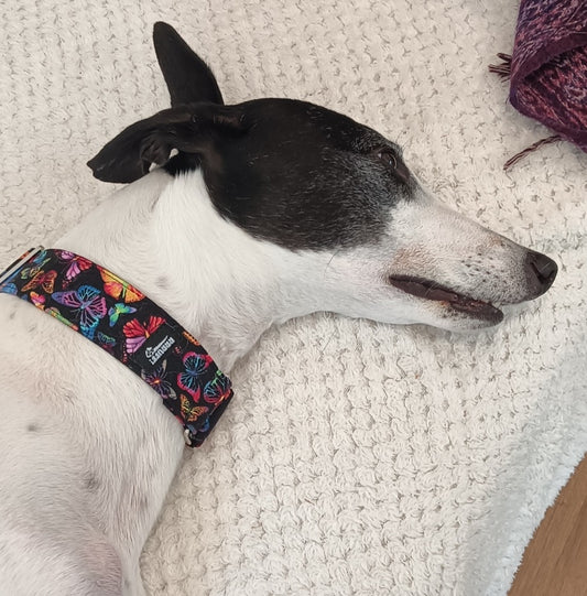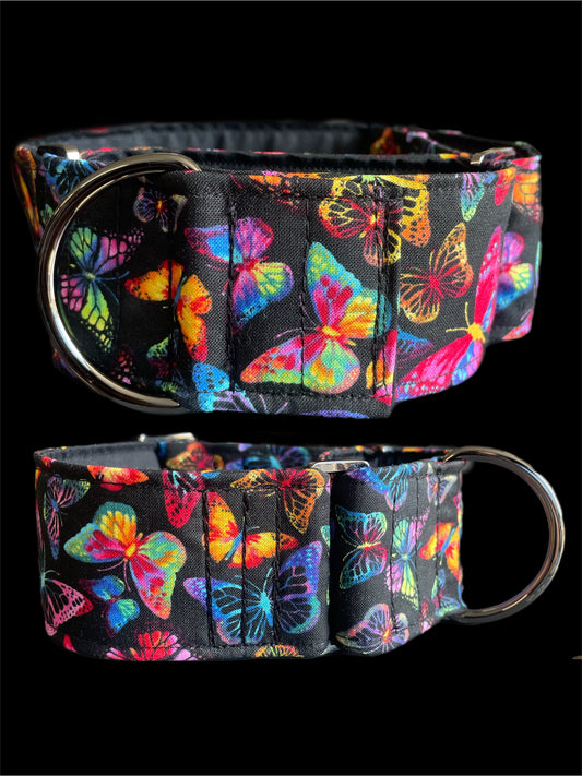 Colourful Butterflies on black Cotton covered greyhound Martingale collar 50mm width super soft