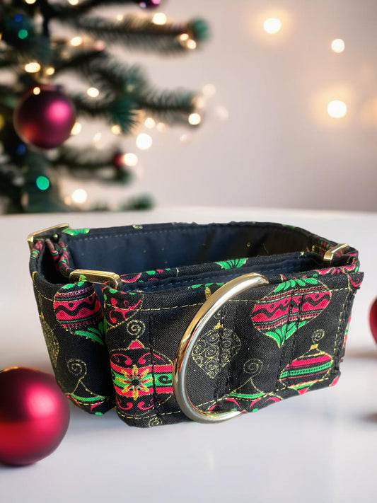 Christmas baubles and gold shimmer thread Cotton covered greyhound Martingale collar comfortable super soft