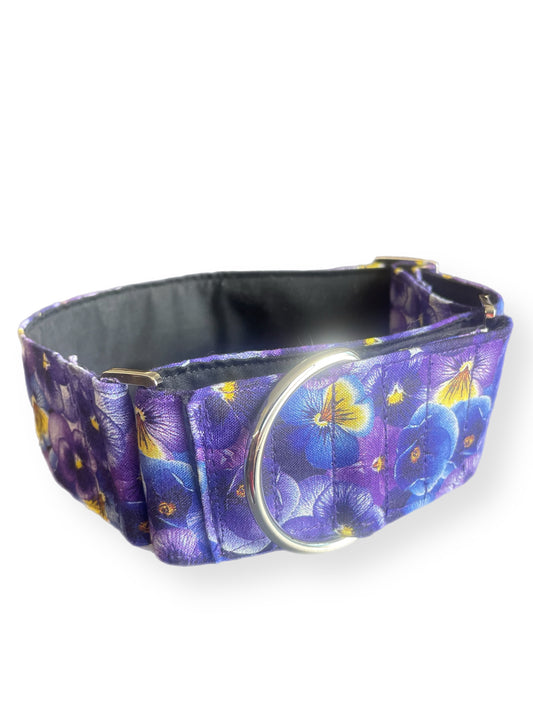 Beautiful pansies on rich purple greyhound Martingale collar cotton covered 50mm width
