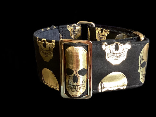Black Martingale collar with metallic golden skulls 50mm width