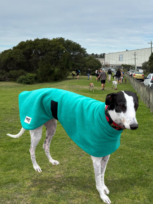 Deluxe whippet coats snuggly thick double fleece in blue with grey inner fleece