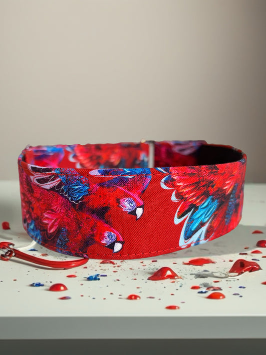 Bold scarlet macaw cotton covered greyhound Martingale collar 38mm wide super soft. Limited stock until after Christmas