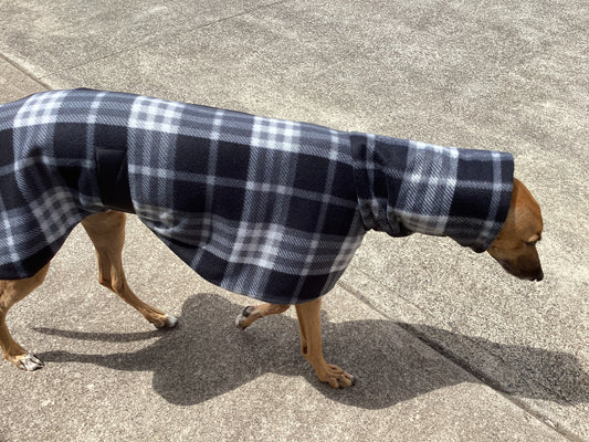 Black and grey check tartan winter deluxe style greyhound coat in double fleece with extra wide neck roll