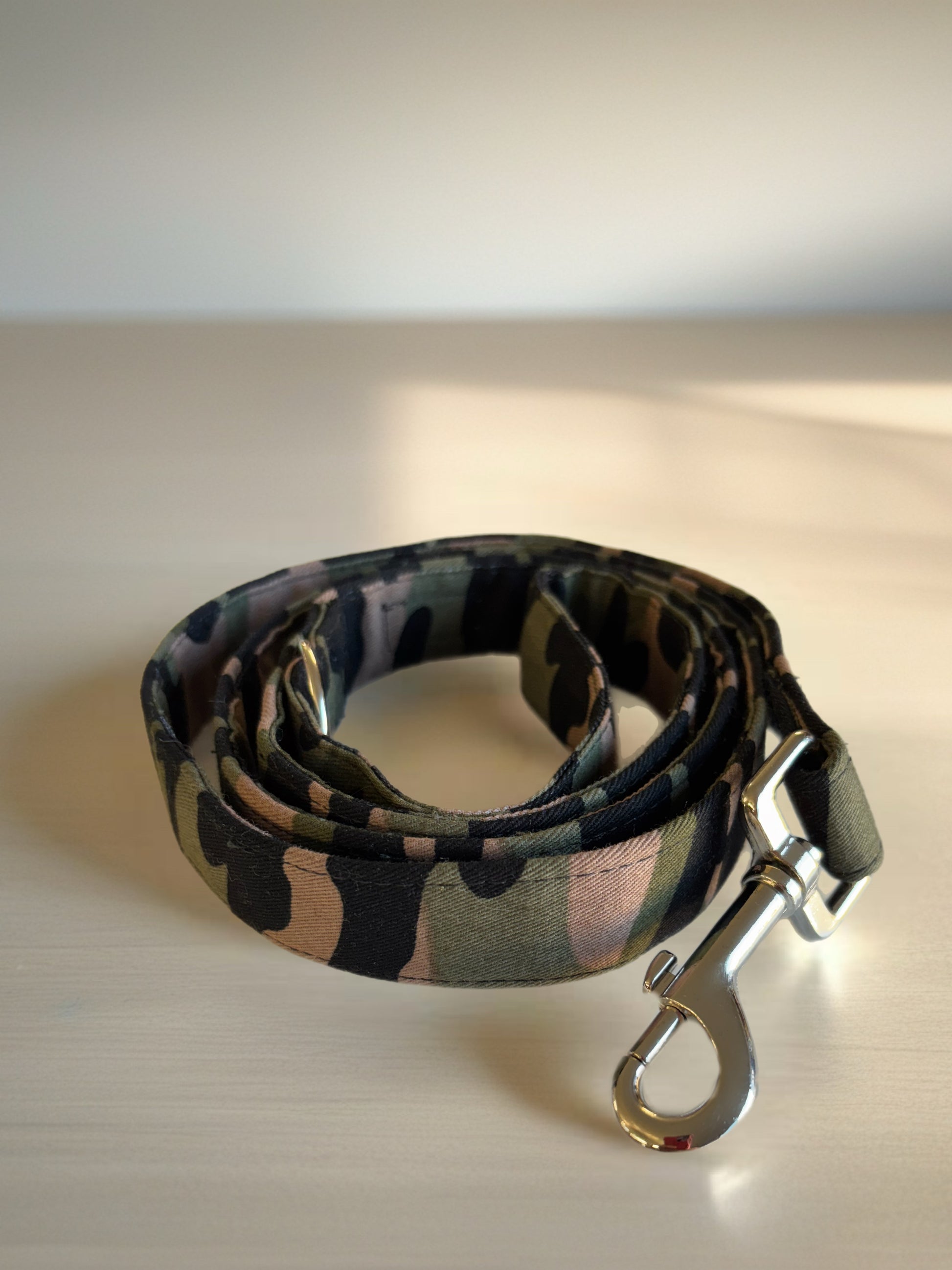 Our most popular camouflage pattern, specifically a woodland-style camo, features an irregular mix of black, olive green, and tan/brown shapes, designed to mimic natural terrain and vegetation. It is commonly used in military clothing and outdoor gear for blending into forested or wooded environments, so careful, don’t lose your hound in the woods lol