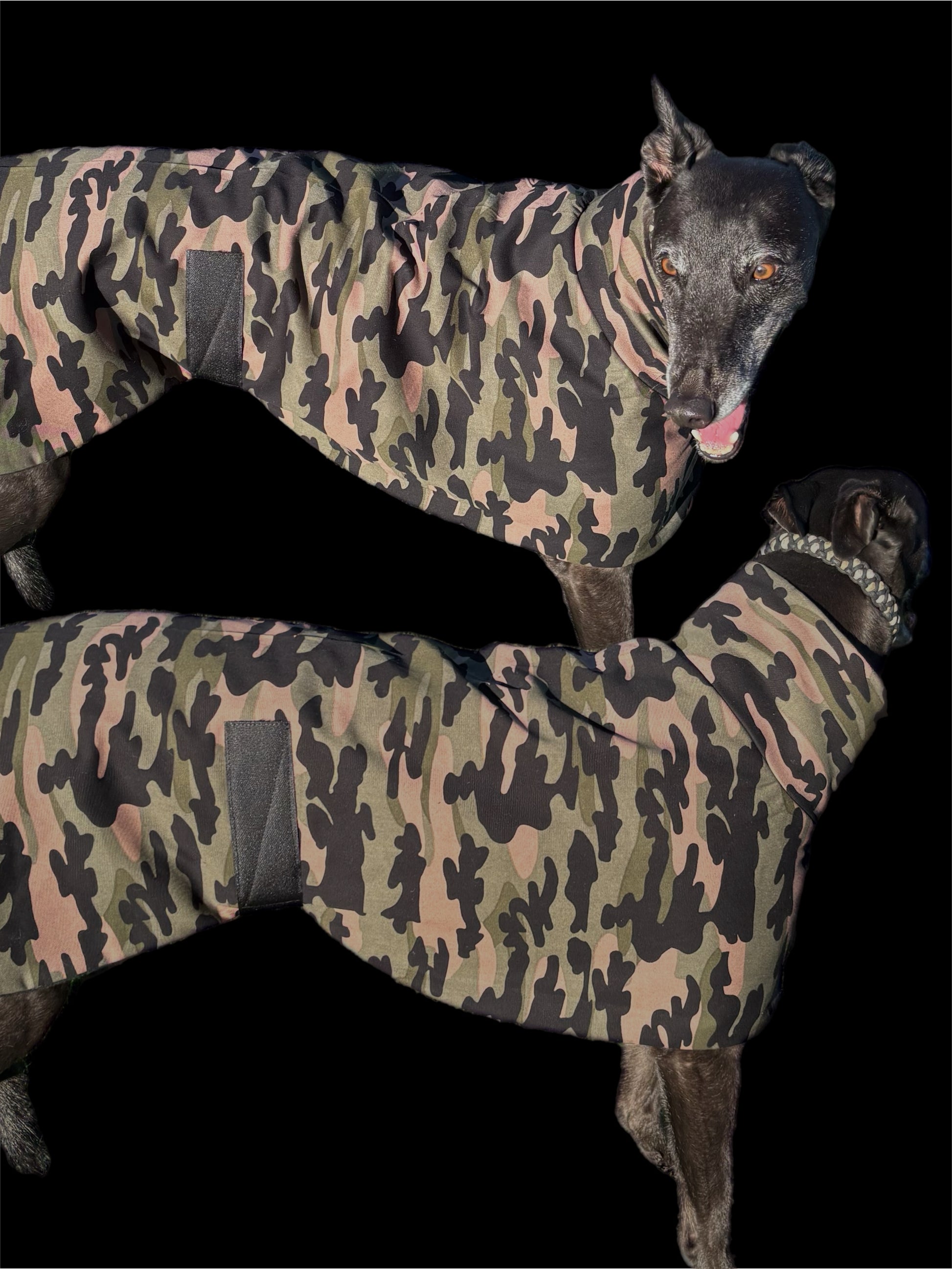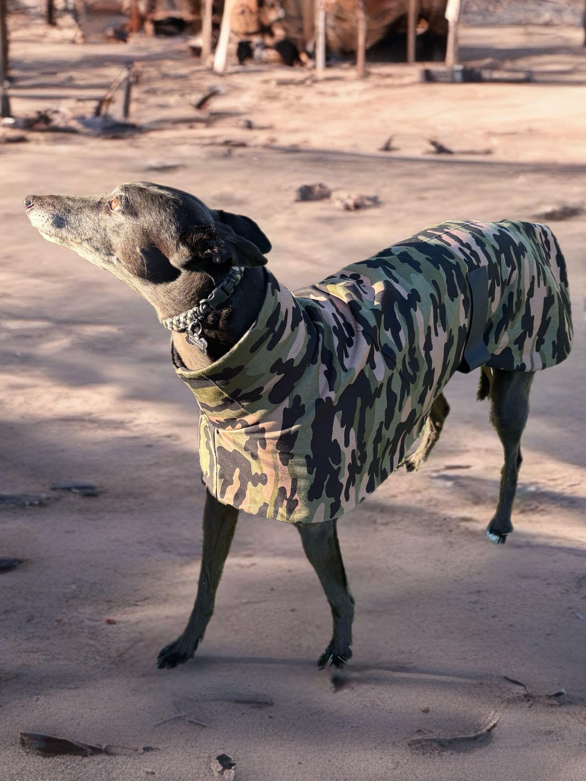 Cammo green Autumn range sports style Greyhound coat in cotton & fleece washable