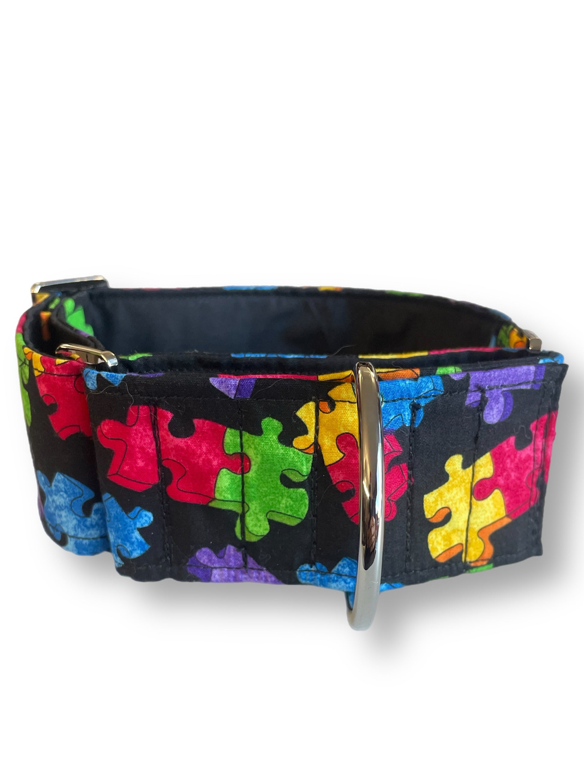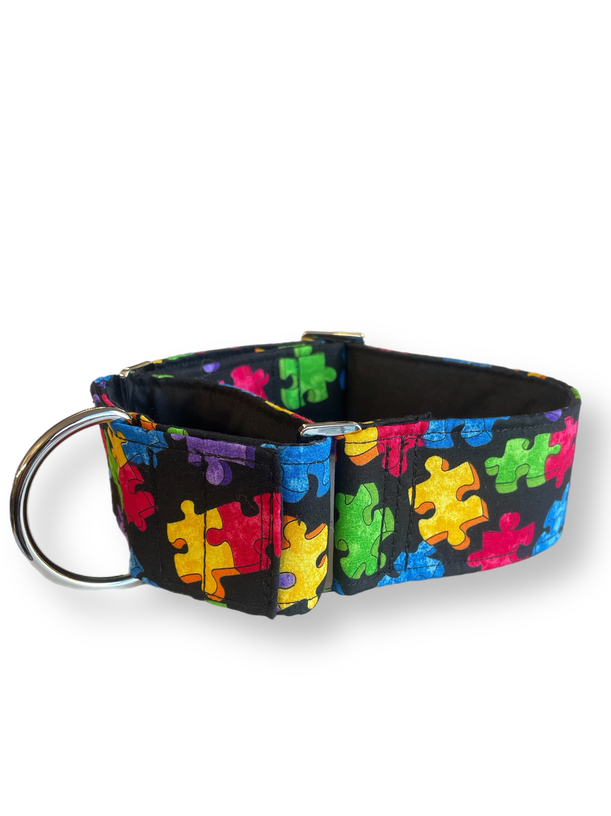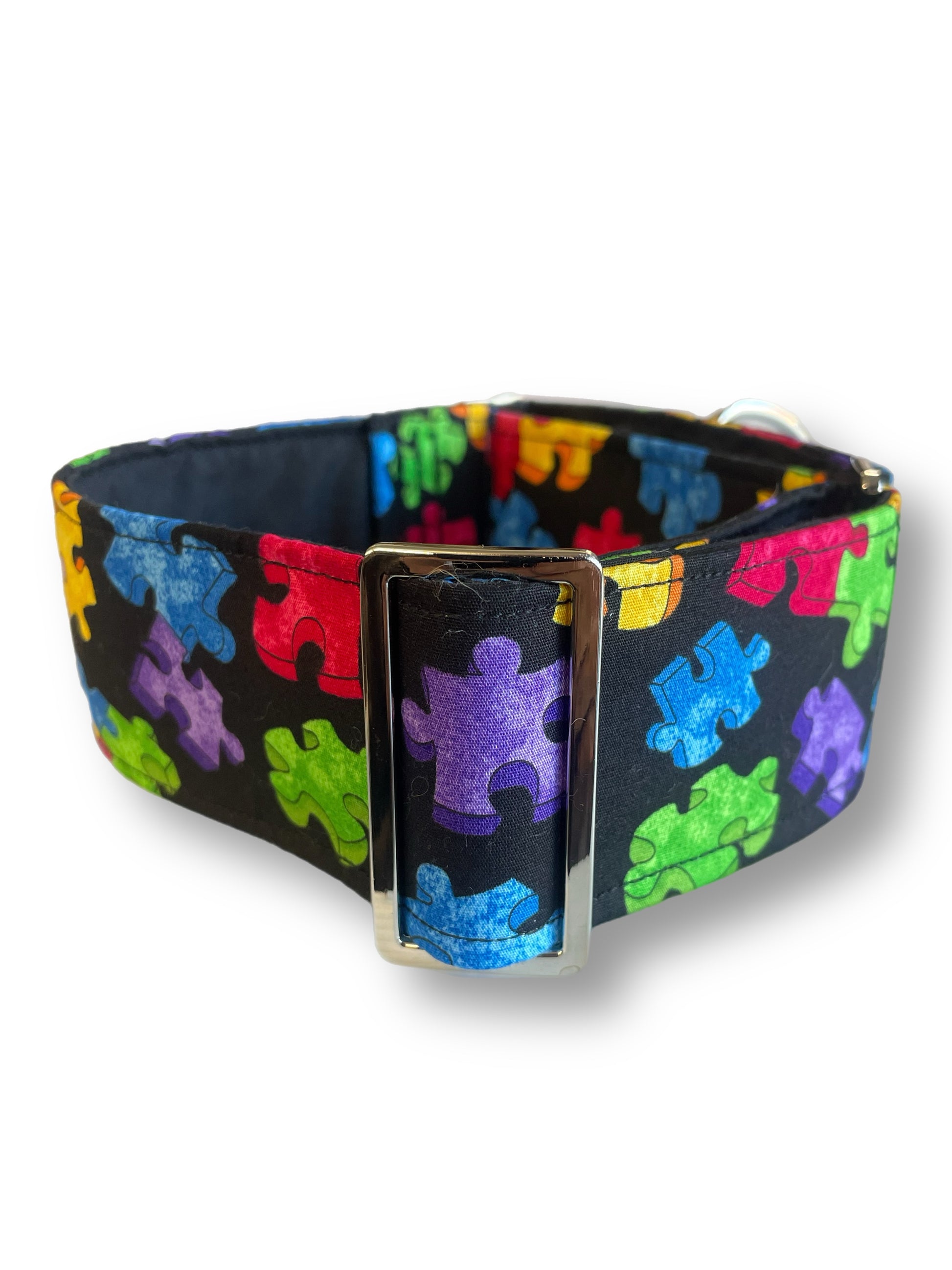 A playful and colorful design featuring a pattern of puzzle pieces. The background is black, which makes the vibrant puzzle pieces stand out. The pieces are in various bright colors, including red, blue, green, yellow, and purple, and they are arranged in a scattered manner across the fabric. The puzzle pieces are slightly textured, giving them a bit of depth. This collar has a lively and cheerful appearance, perfect for those who enjoy bold, whimsical patterns.