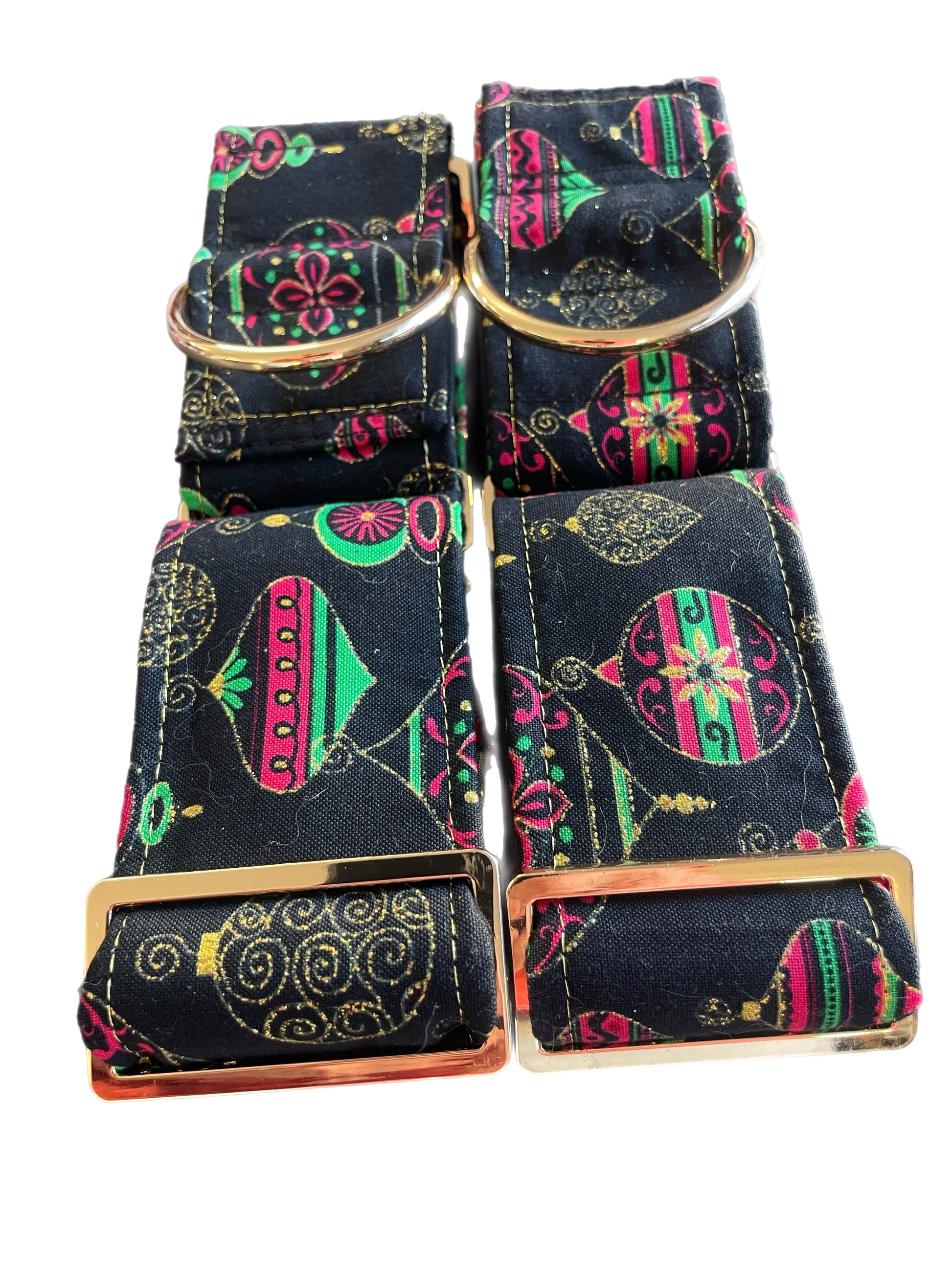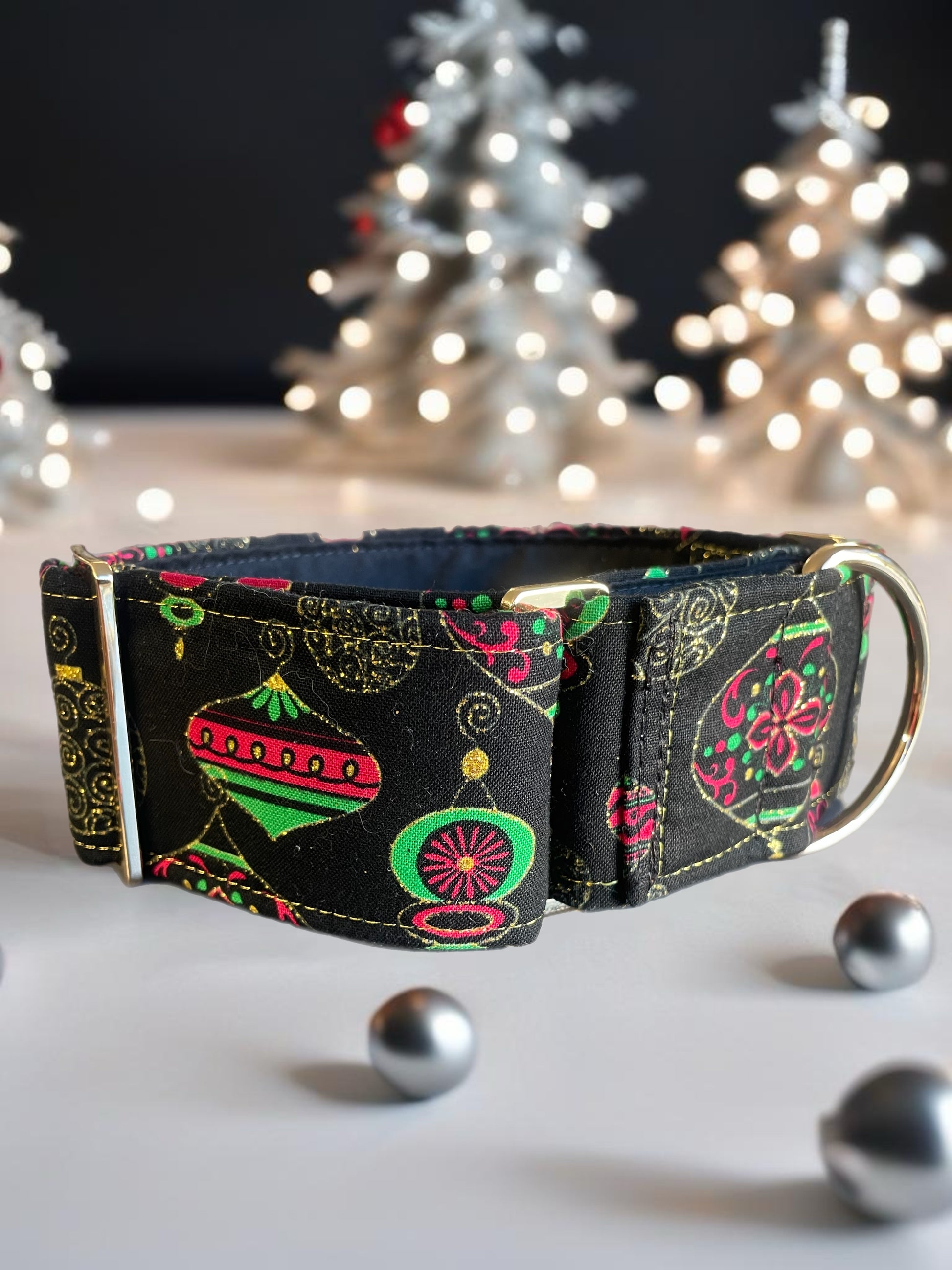 Christmas baubles and gold shimmer thread Cotton covered greyhound Martingale collar comfortable super soft