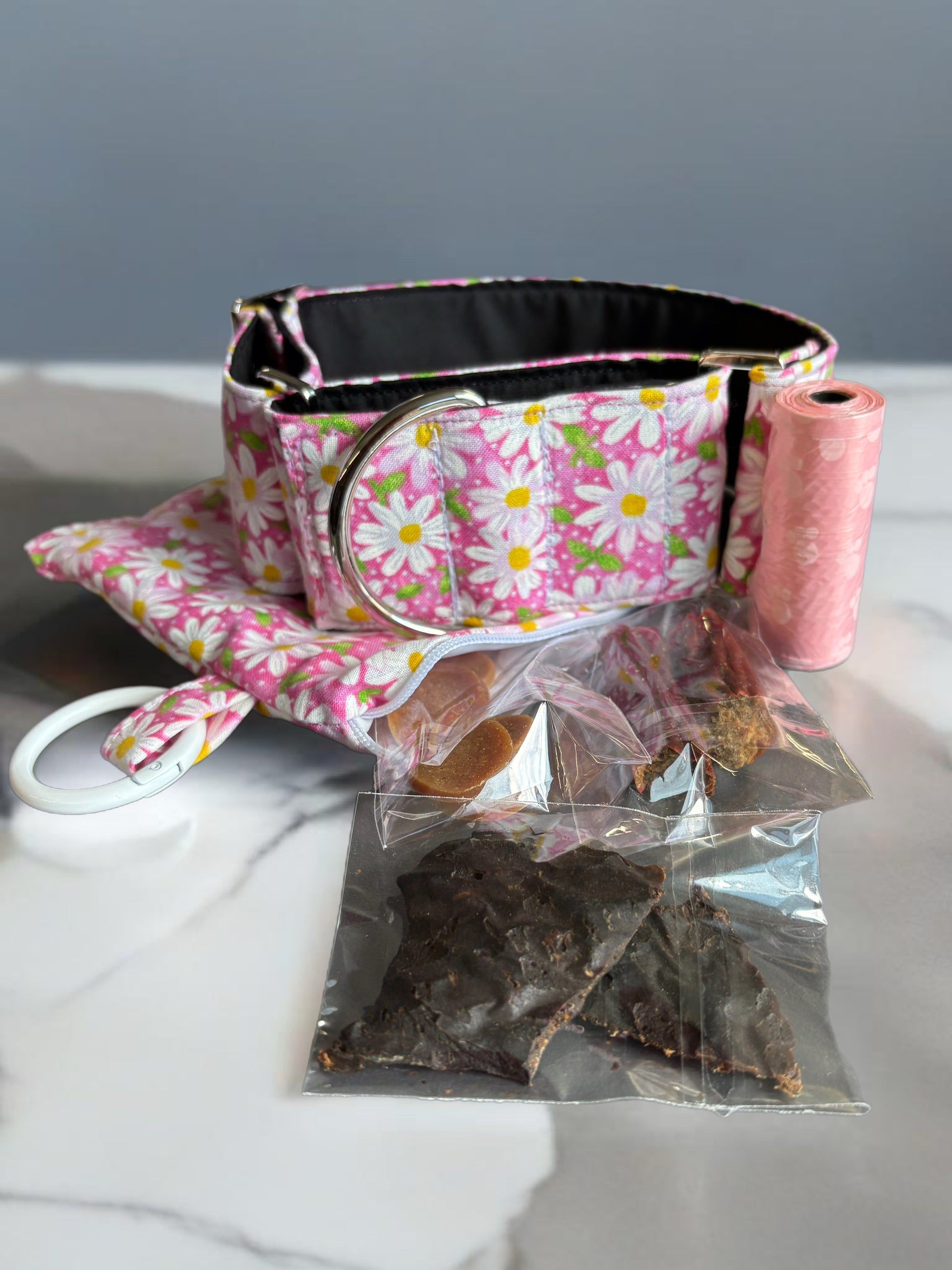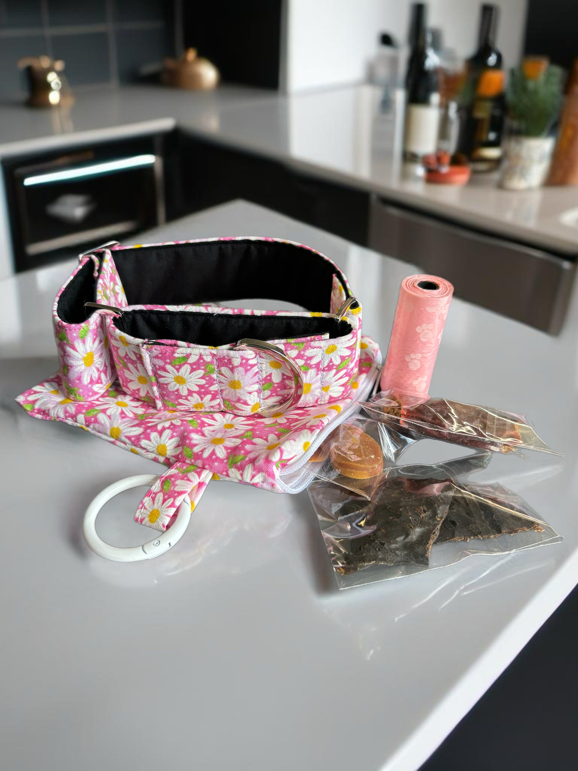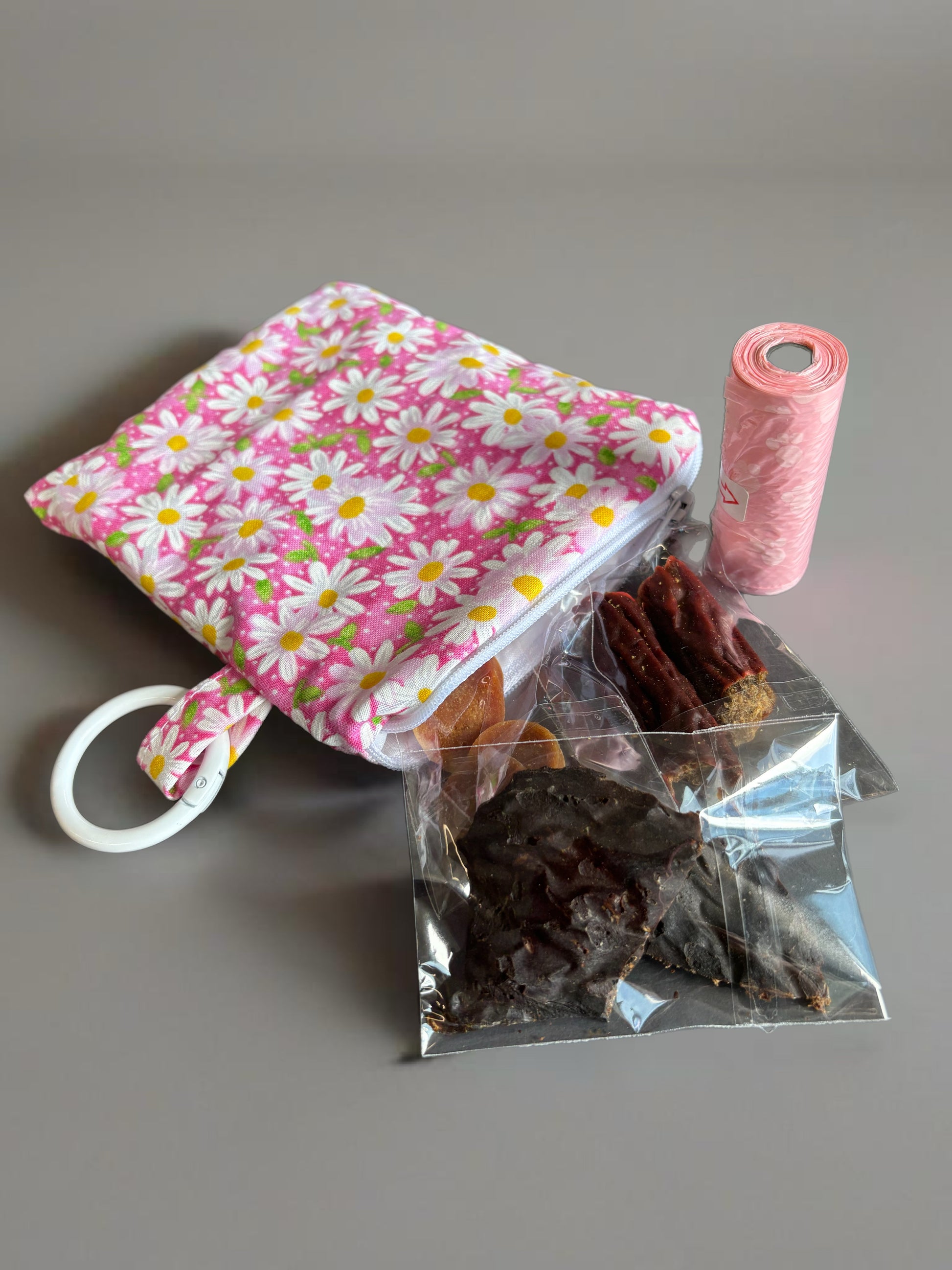 *Matching go bag is available with removable carabiner to attach to harness, belt loop, leash, anything. It also comes with a roll of poo bags and treats, ready to go!