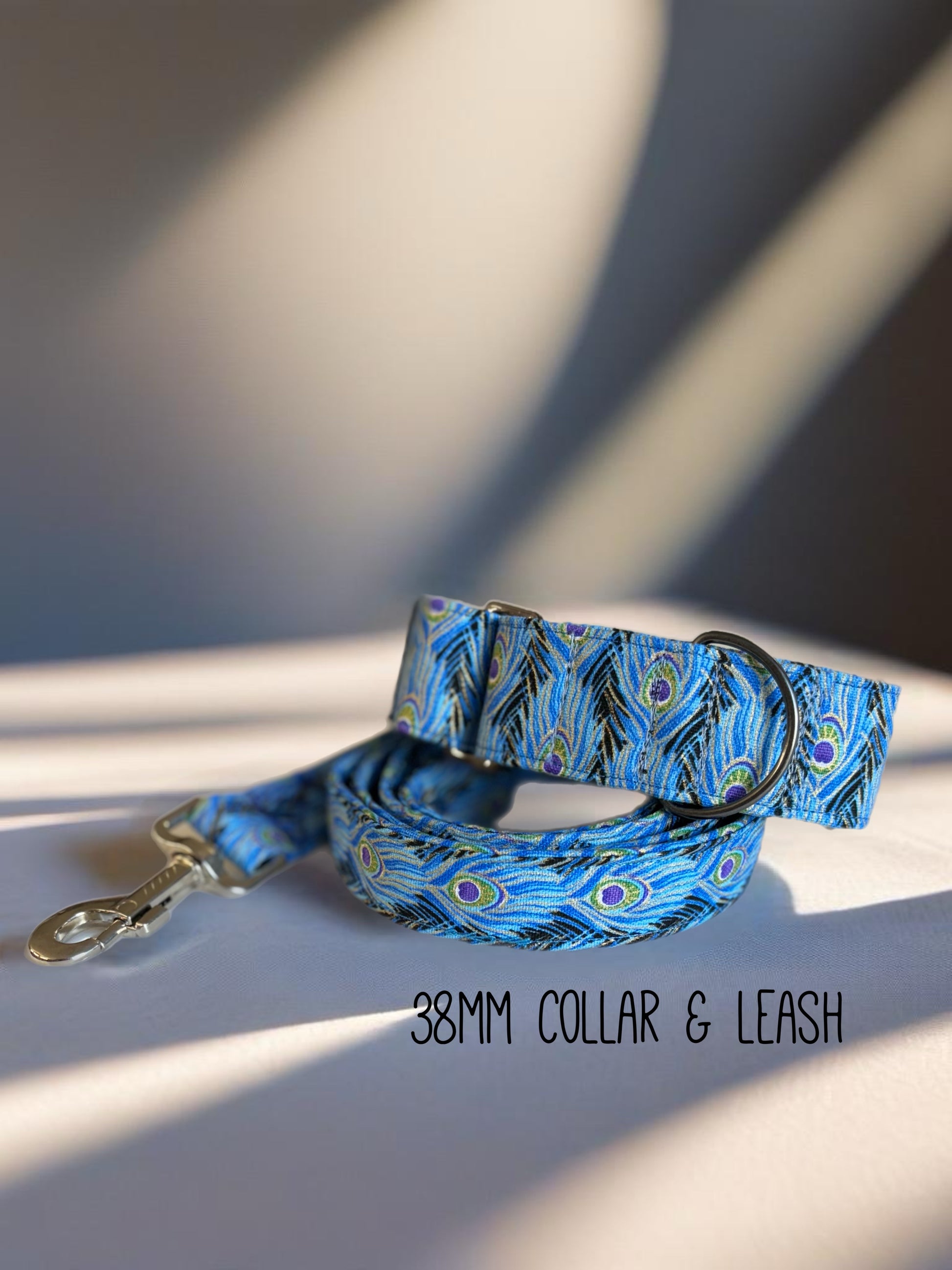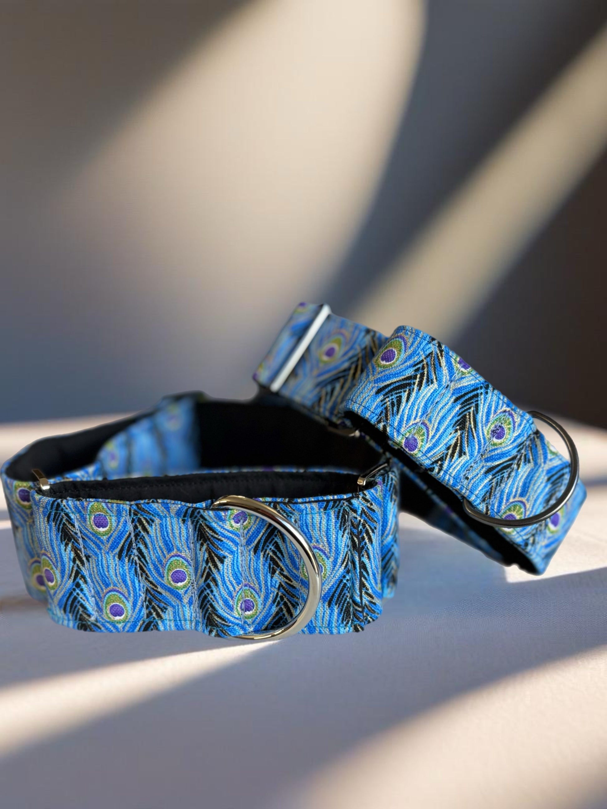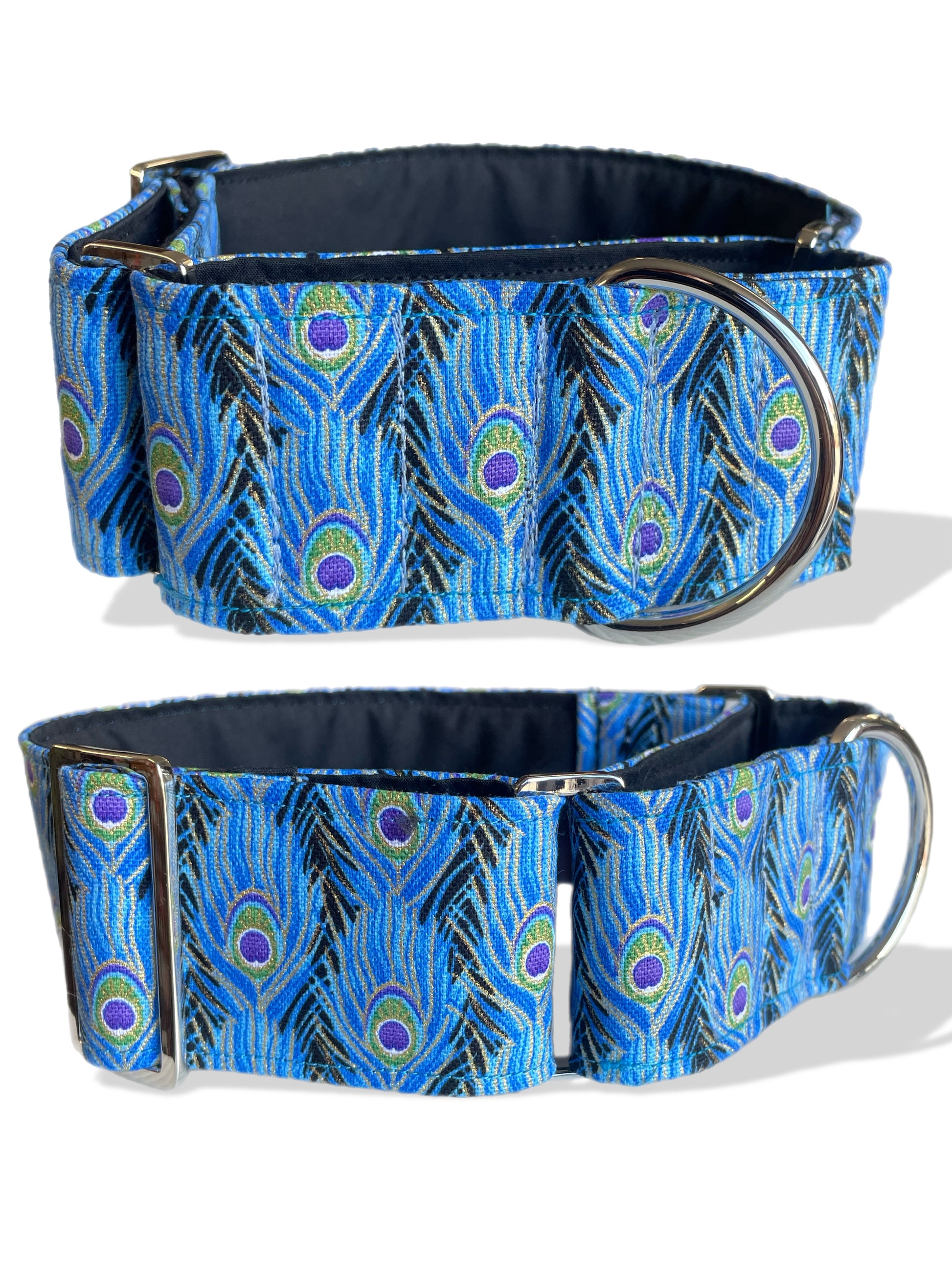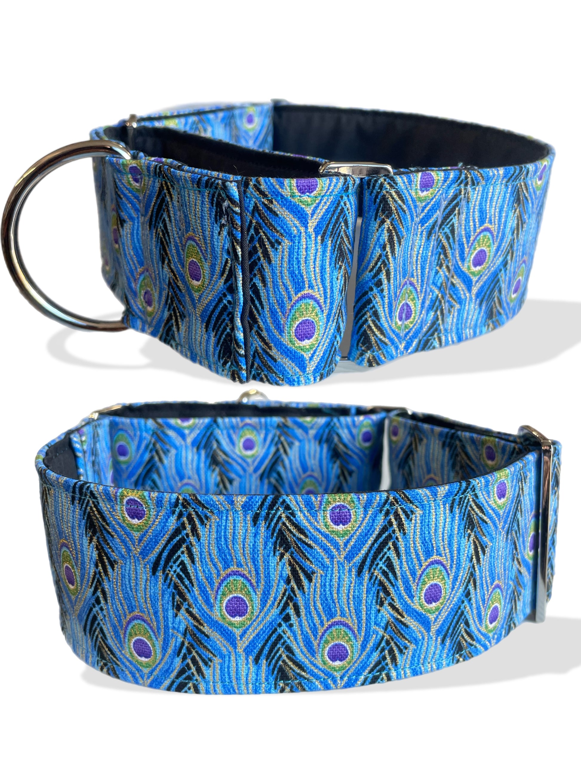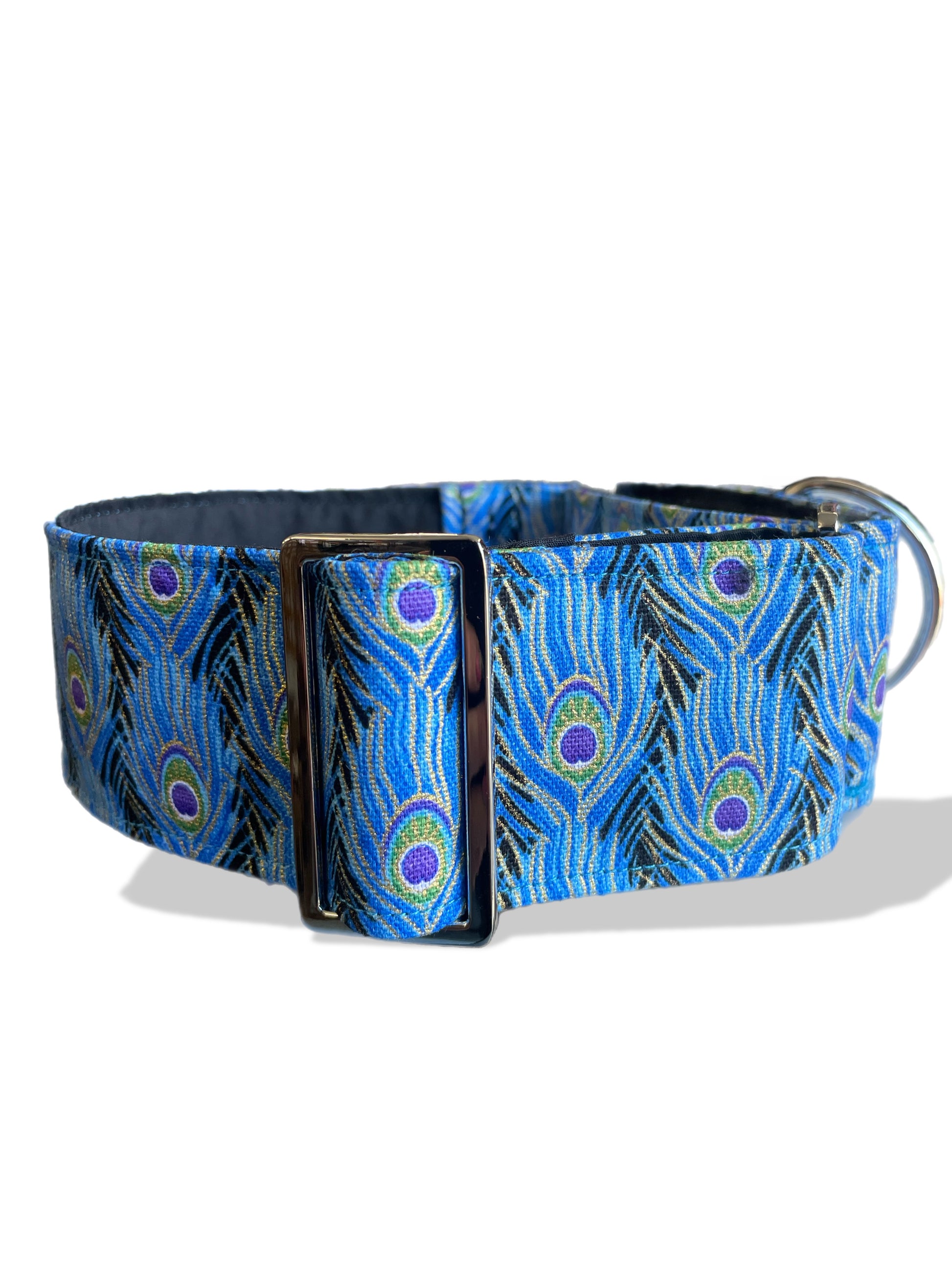 Peacock feathers featuring a shimmer thread cotton covered greyhound Martingale collar 50mm width