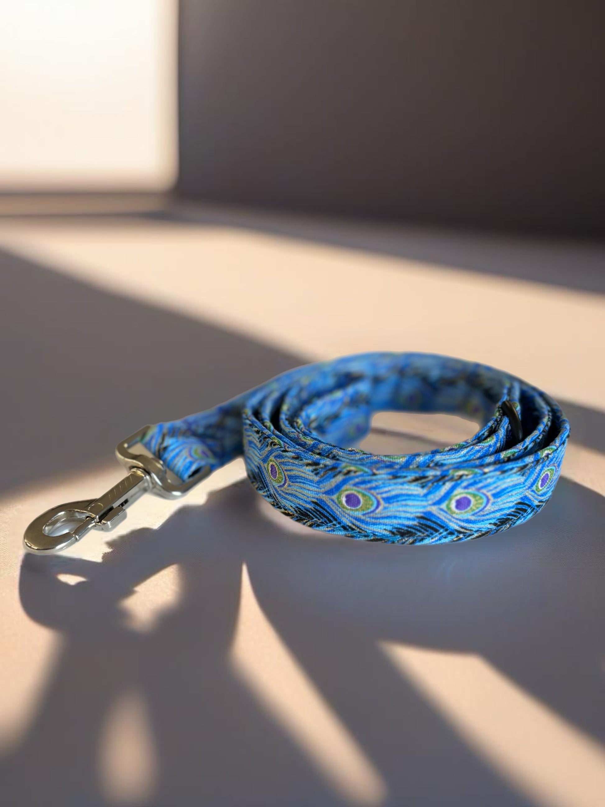 The design on the collar features a peacock feather pattern with vibrant colors. The feathers are primarily blue, with accents of green, purple, and black. The central "eye" of the feather is purple, surrounded by green. The design gives it a detailed and textured appearance. The overall look is striking and elegant, reminiscent of the regal and intricate patterns found in peacock feathers.