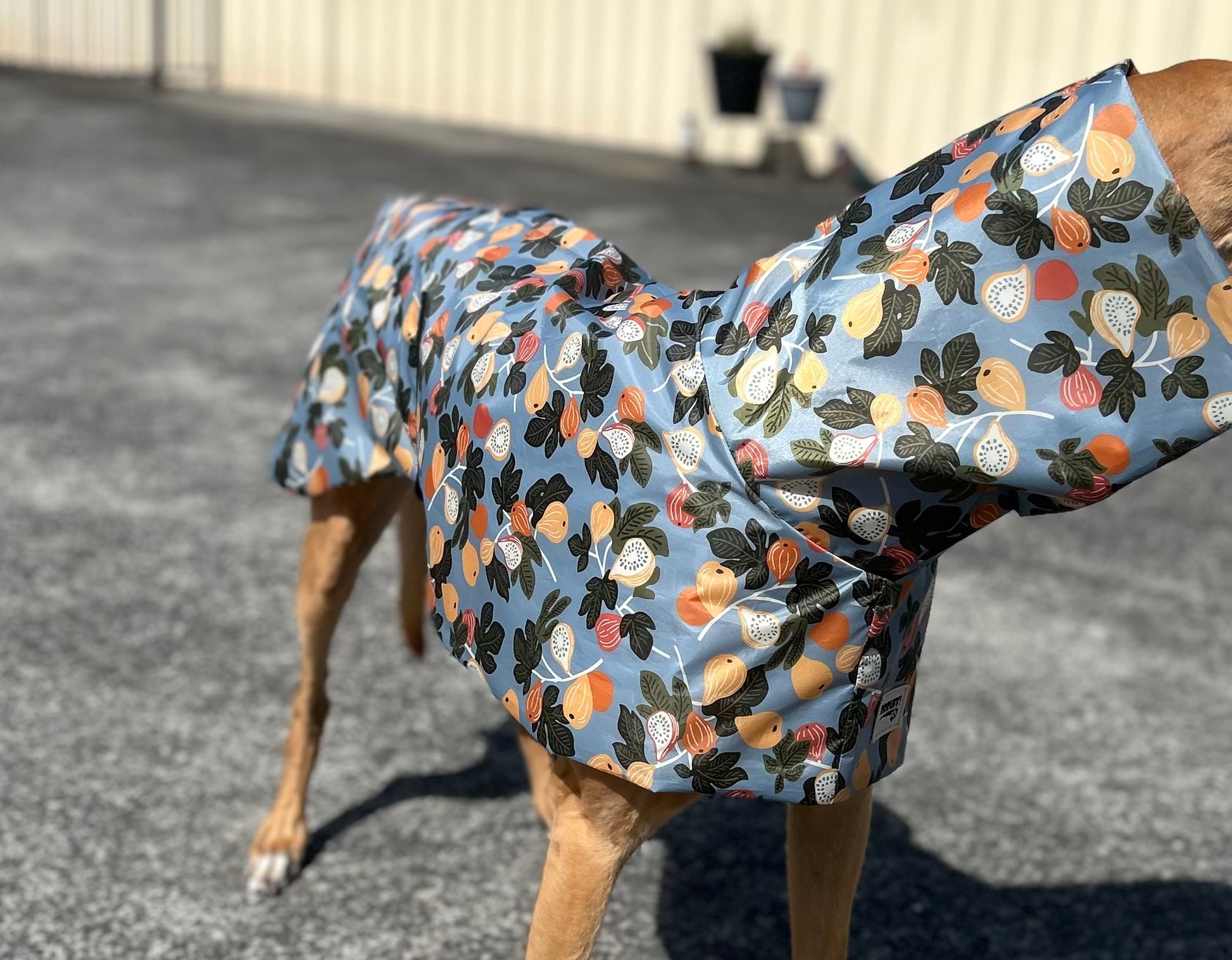 This is a lightweight summer raincoat for greyhounds, designed to keep them dry and comfy in warmer weather.