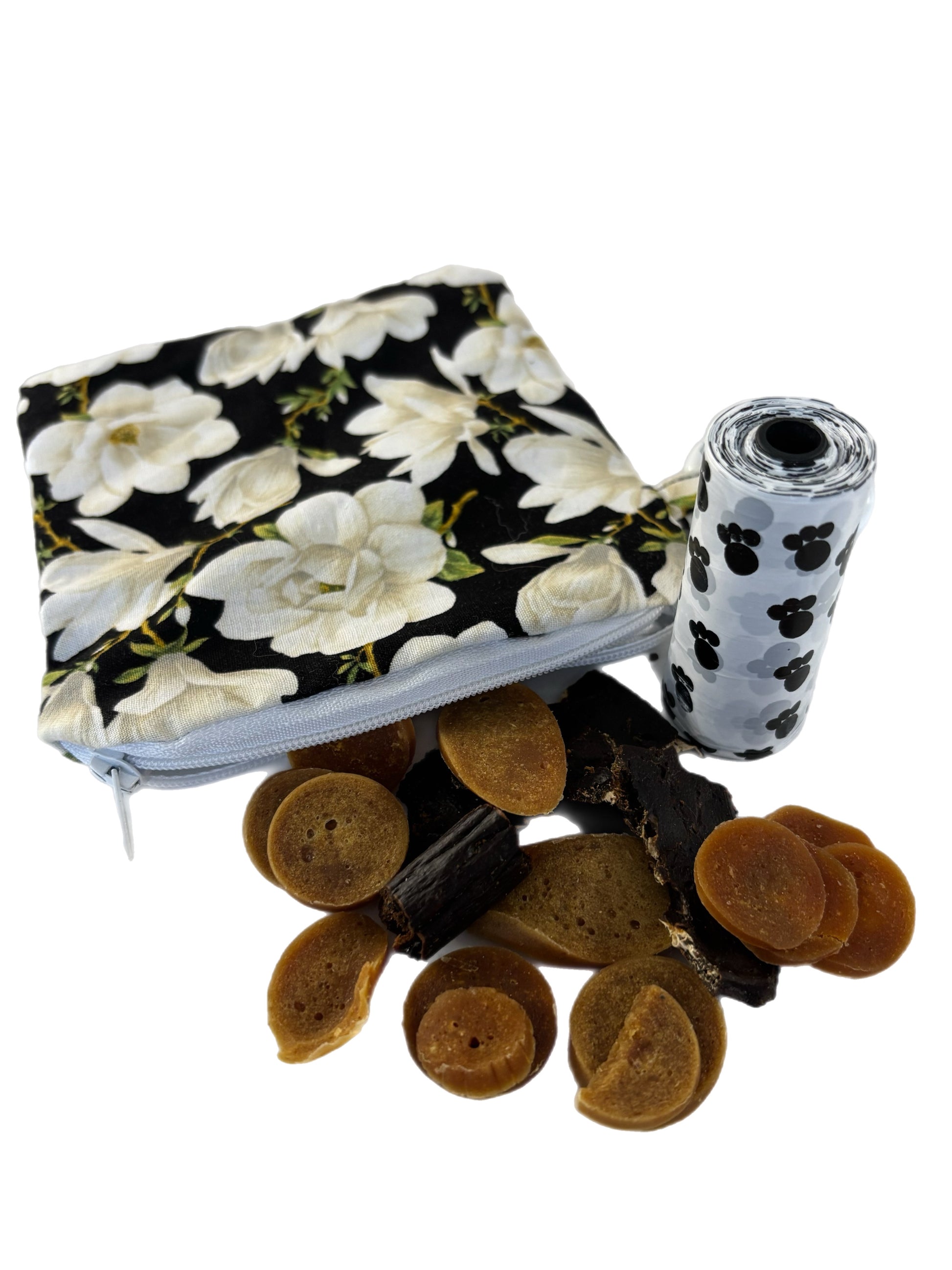 *matching go bag comes with removable metal round spring clip, this can be attached to the dog’s harness, the leash, your handbag or even a belt loop.