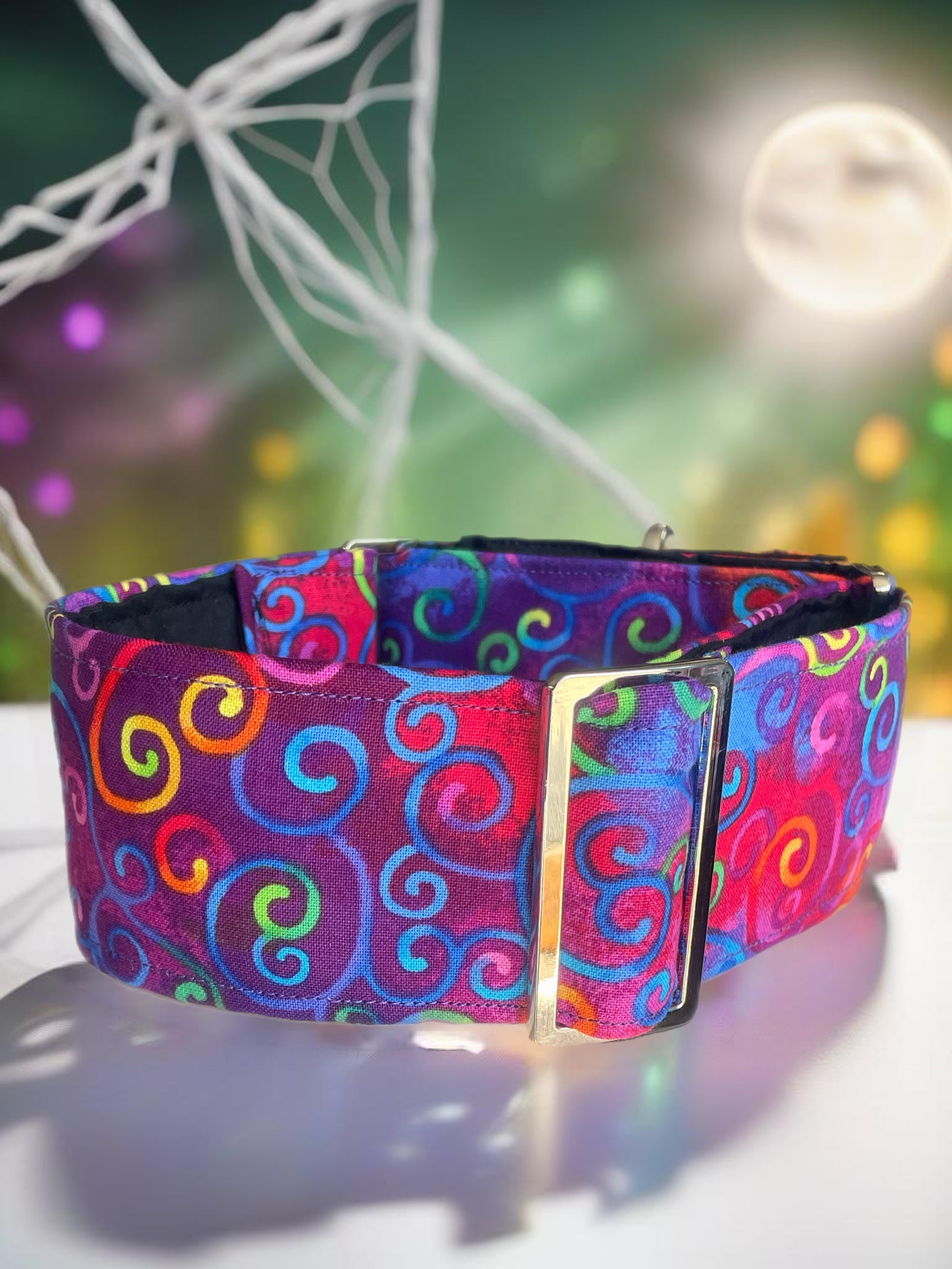The design on this collar is a vibrant and playful pattern featuring a swirling, spiral motif. The background is a rich purple, which serves as a contrasting backdrop for the colorful swirls in shades of blue, green, yellow, red, orange, and pink. The swirls vary in size and direction, creating a dynamic and energetic look. The colors and patterns give the collar a lively and eye-catching appearance, perfect for adding a pop of color and personality.