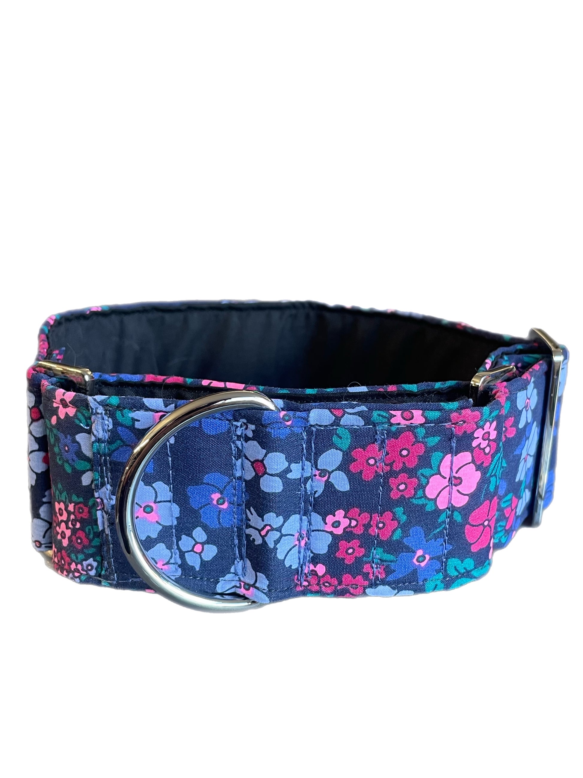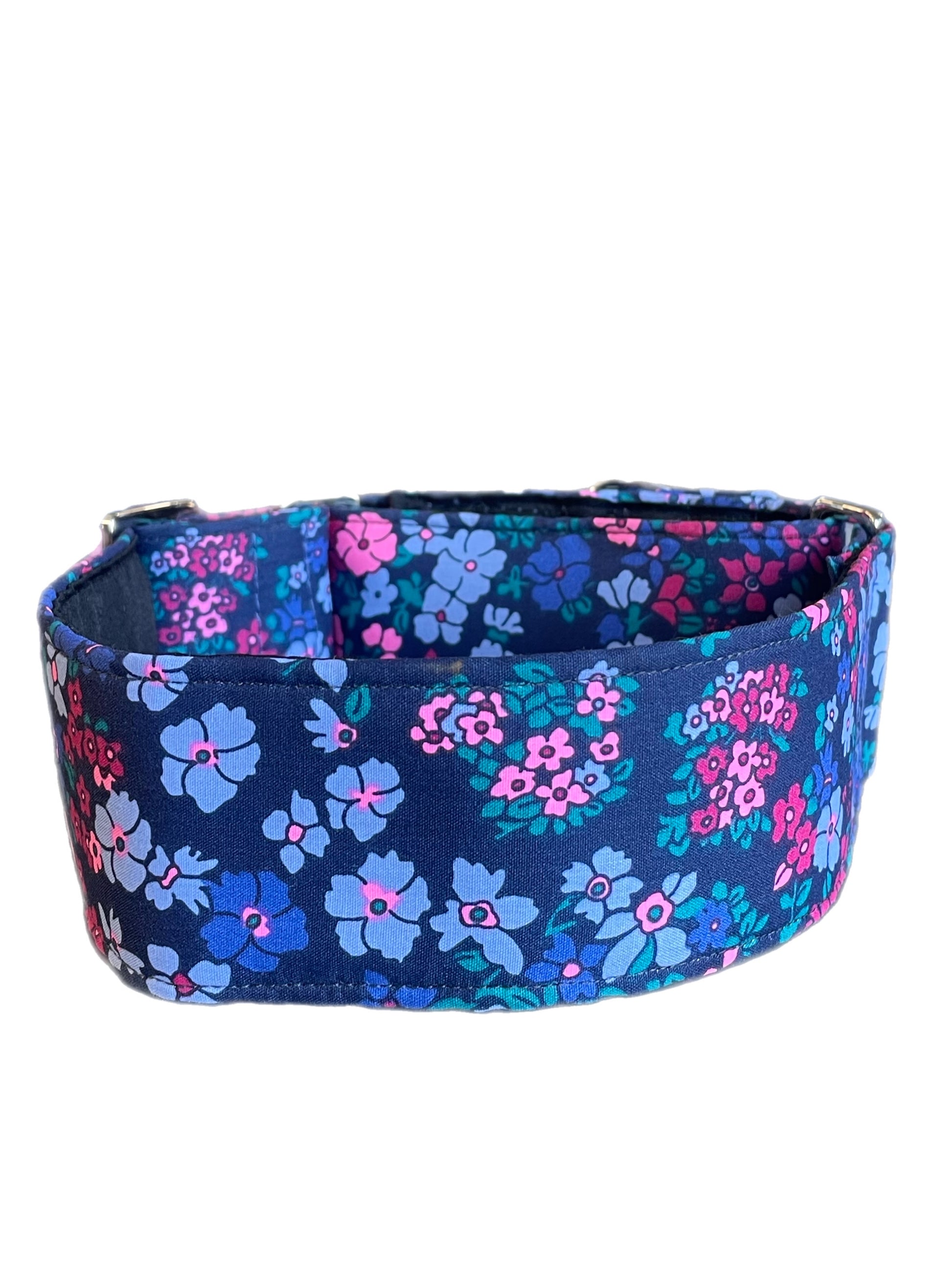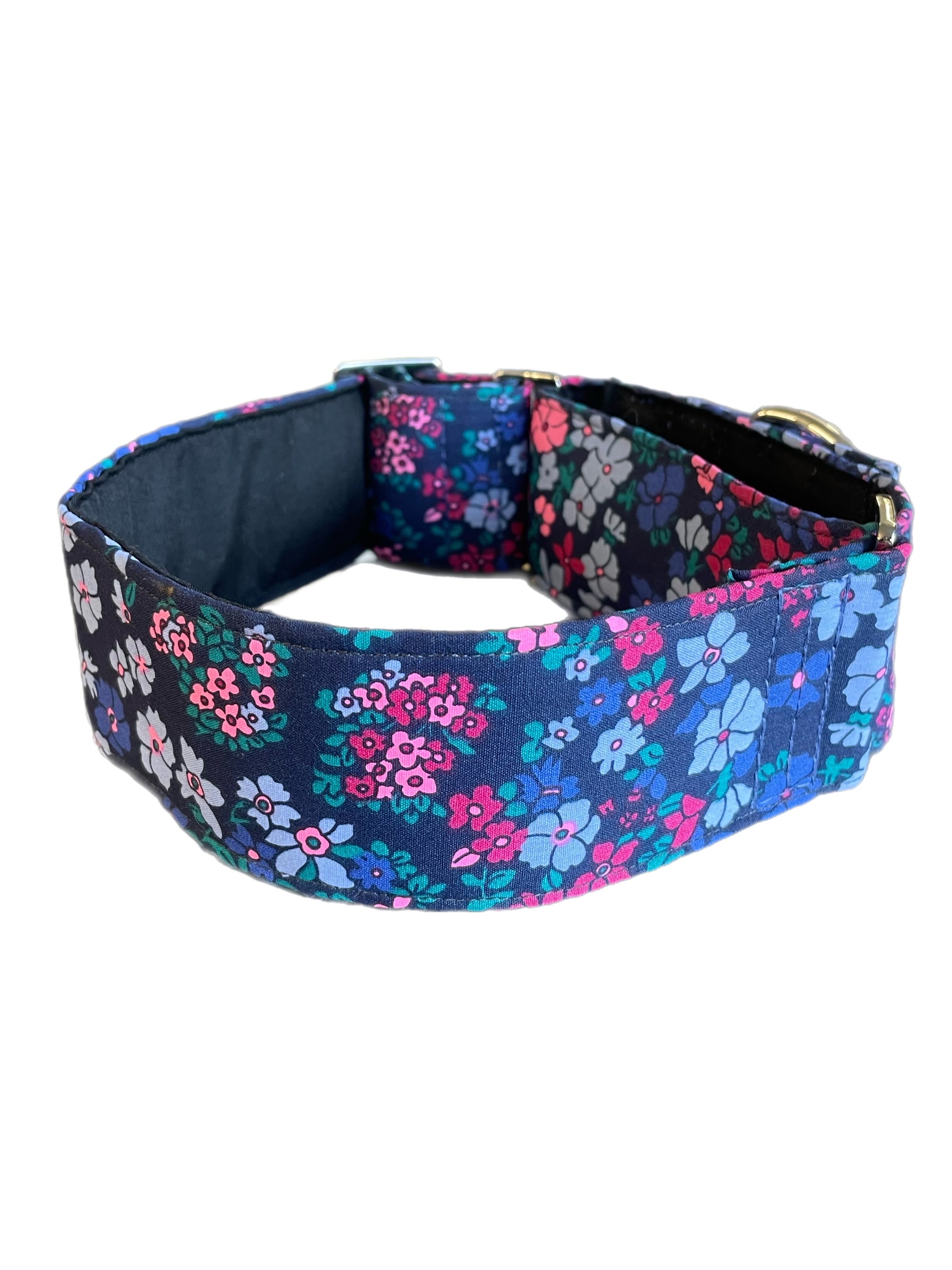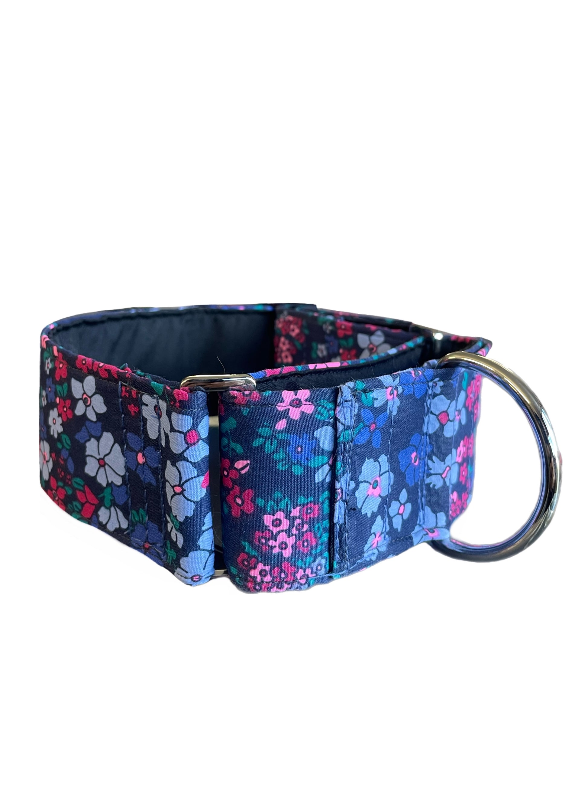 Cotton covered floral print on navy greyhound Martingale collar 50mm width, whippet 38mm