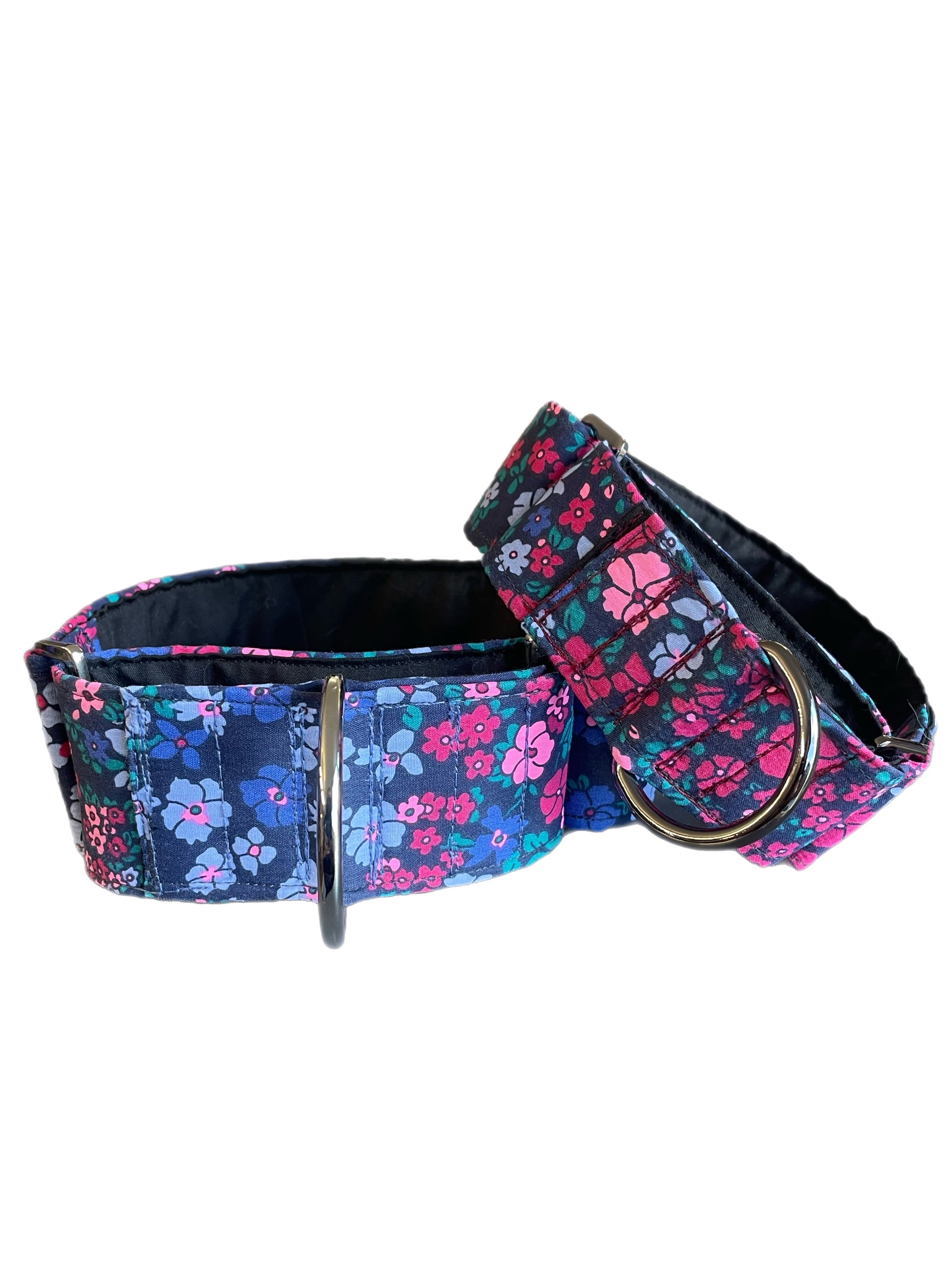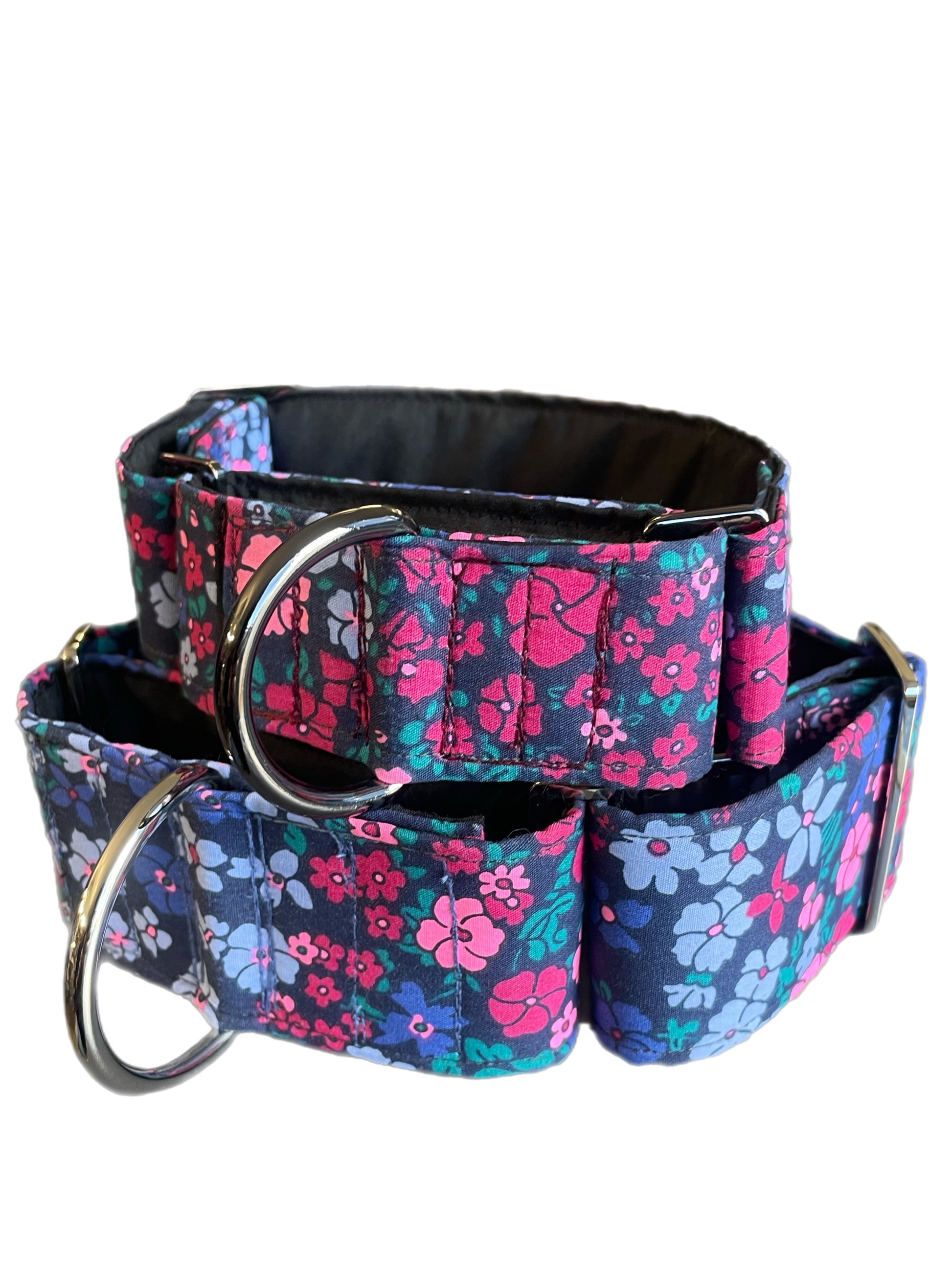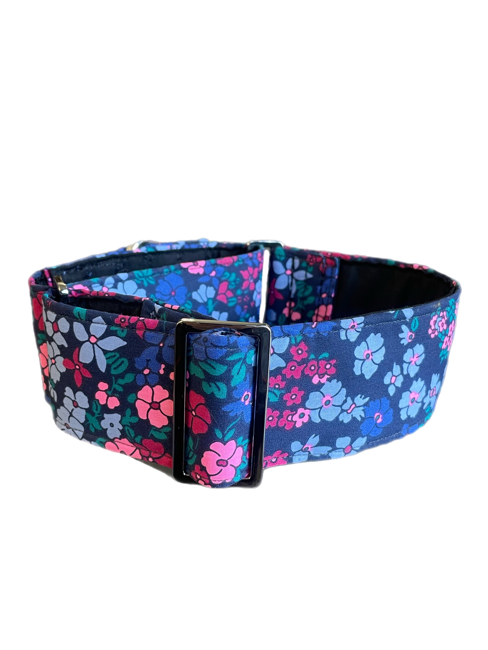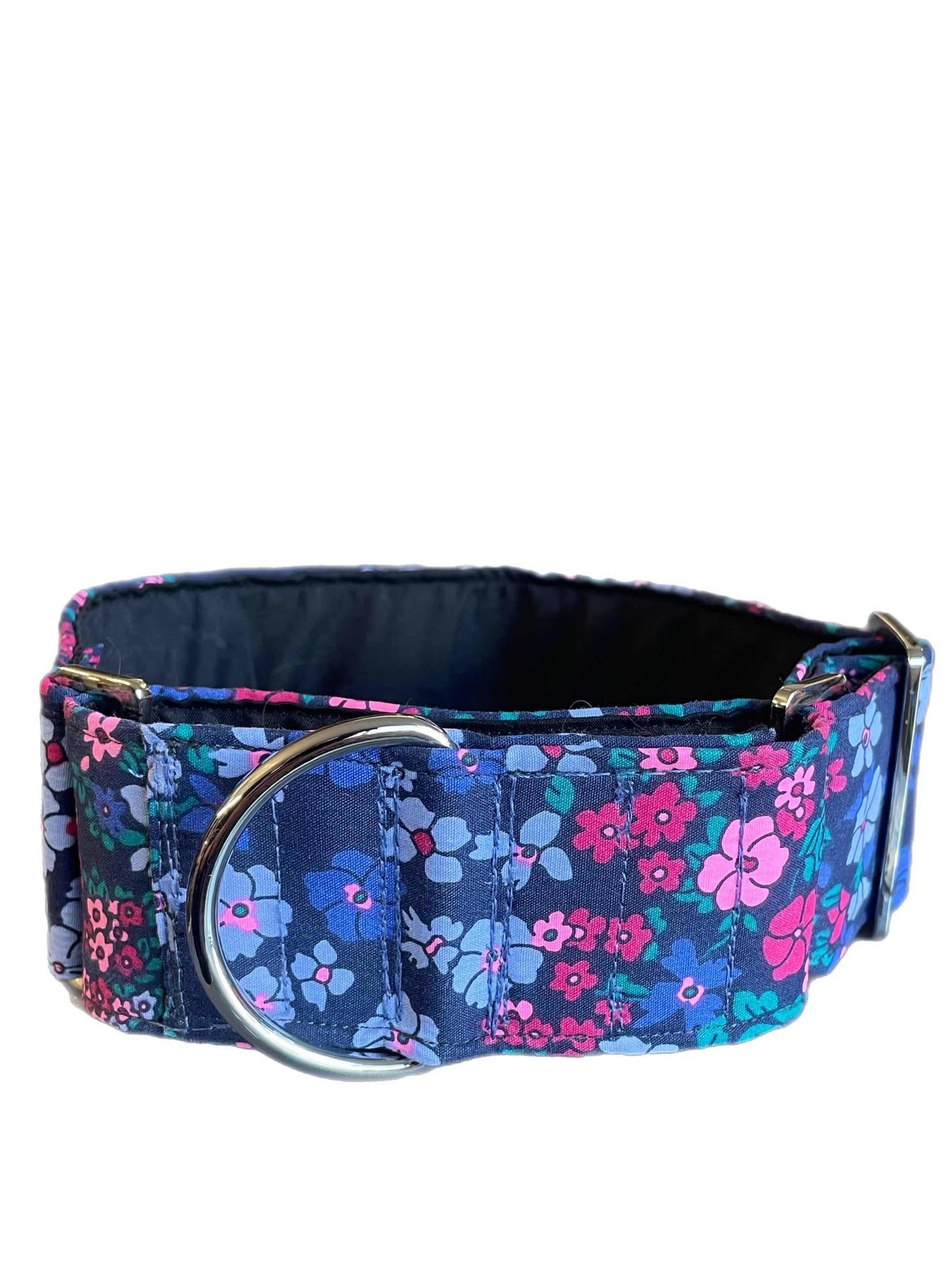 Cotton covered floral print on navy greyhound Martingale collar 50mm width, whippet 38mm