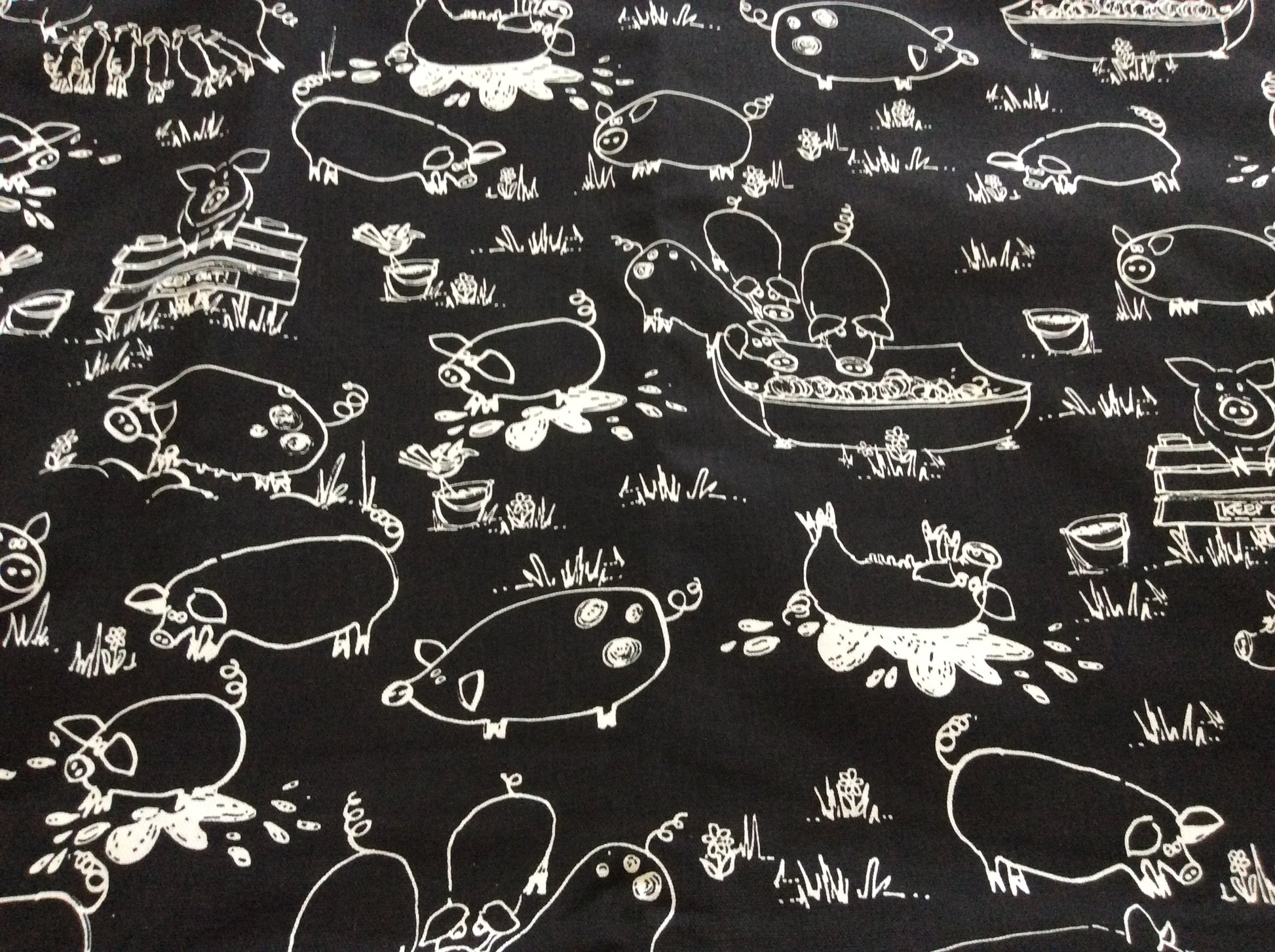 Black with farmyard piggies design, thick cotton covers with zips. Reclaimed vintage cotton/linen blend. Pre shrunk, brand new fabric