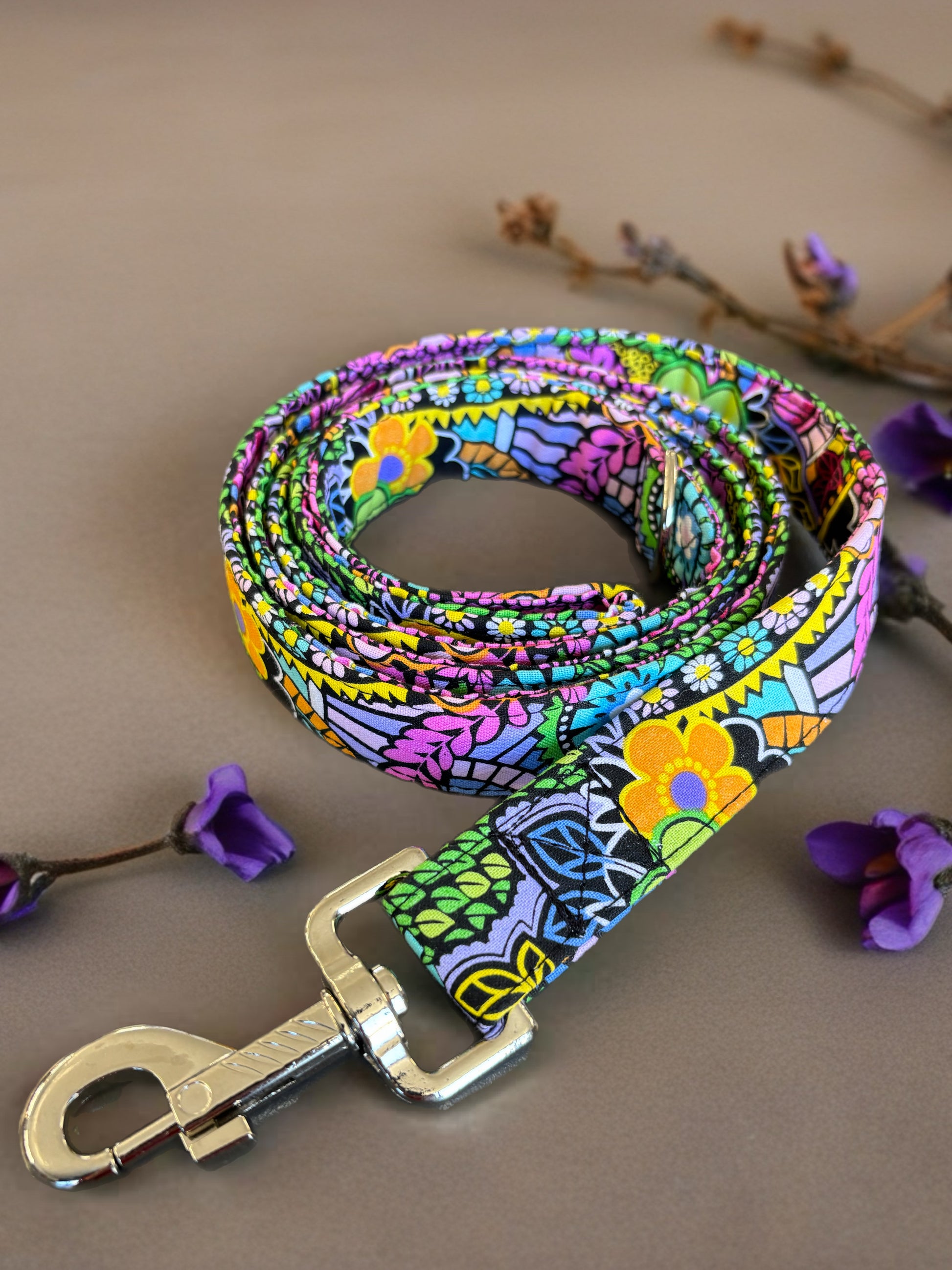 A whole fiesta of colour wrapped around your hound’s neck! This joyful print is bursting with oversized cartoon blossoms, zig-zag petals, leafy swirls, and tiny rainbow blooms — all dancing together like they’re at the happiest garden party ever.