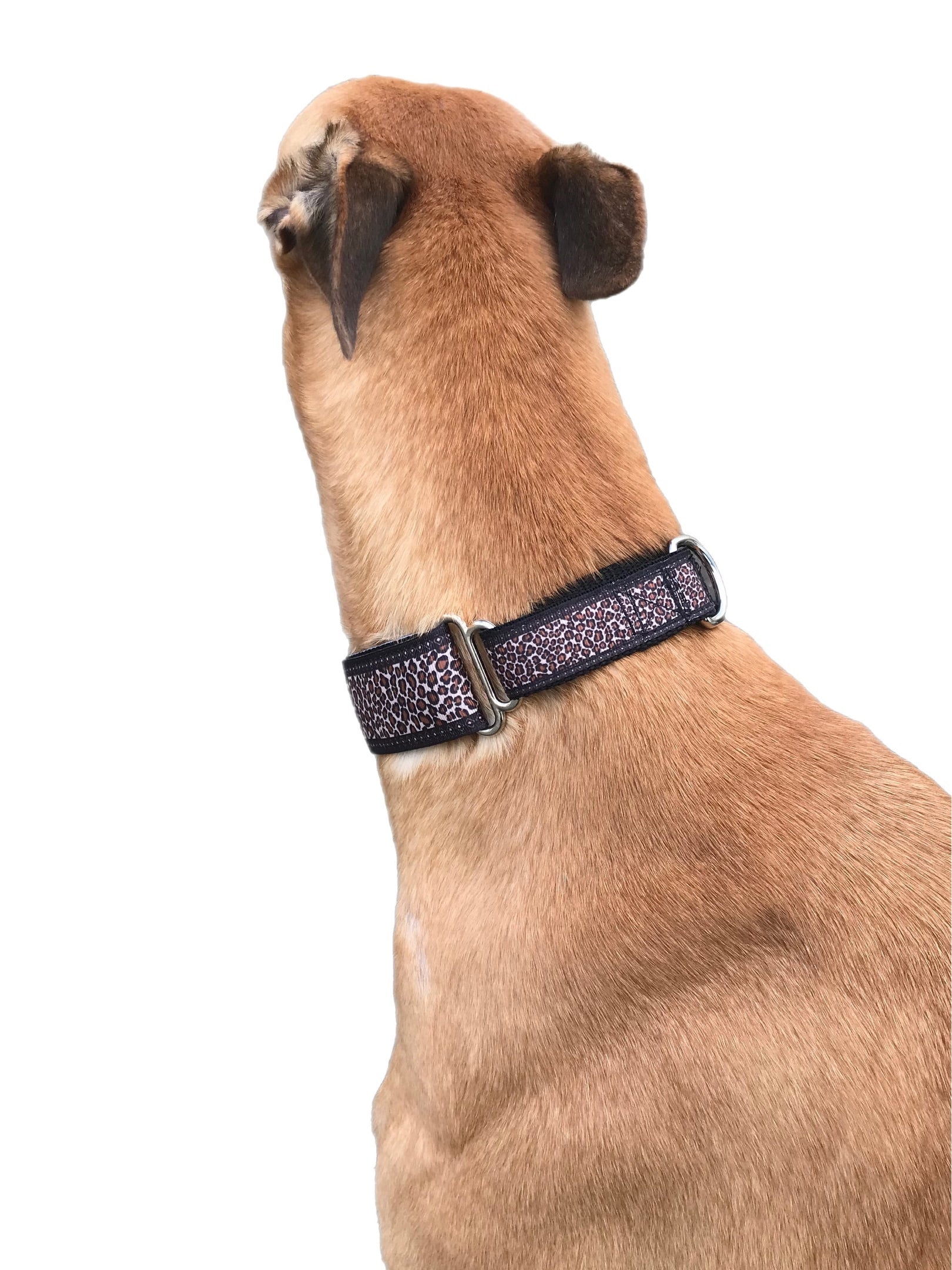 This designed grosgrain ribbon sewn onto black inner cotton webbing, makes a fashionable martingale collar. Triple stitched to assure longevity, and strength.