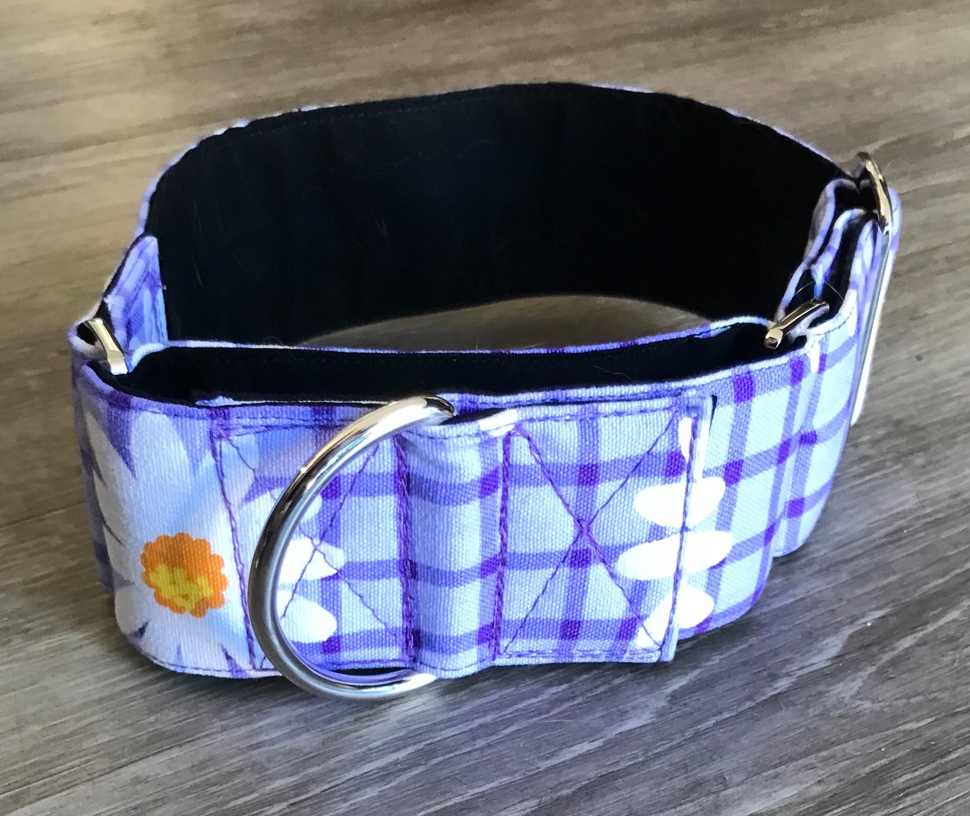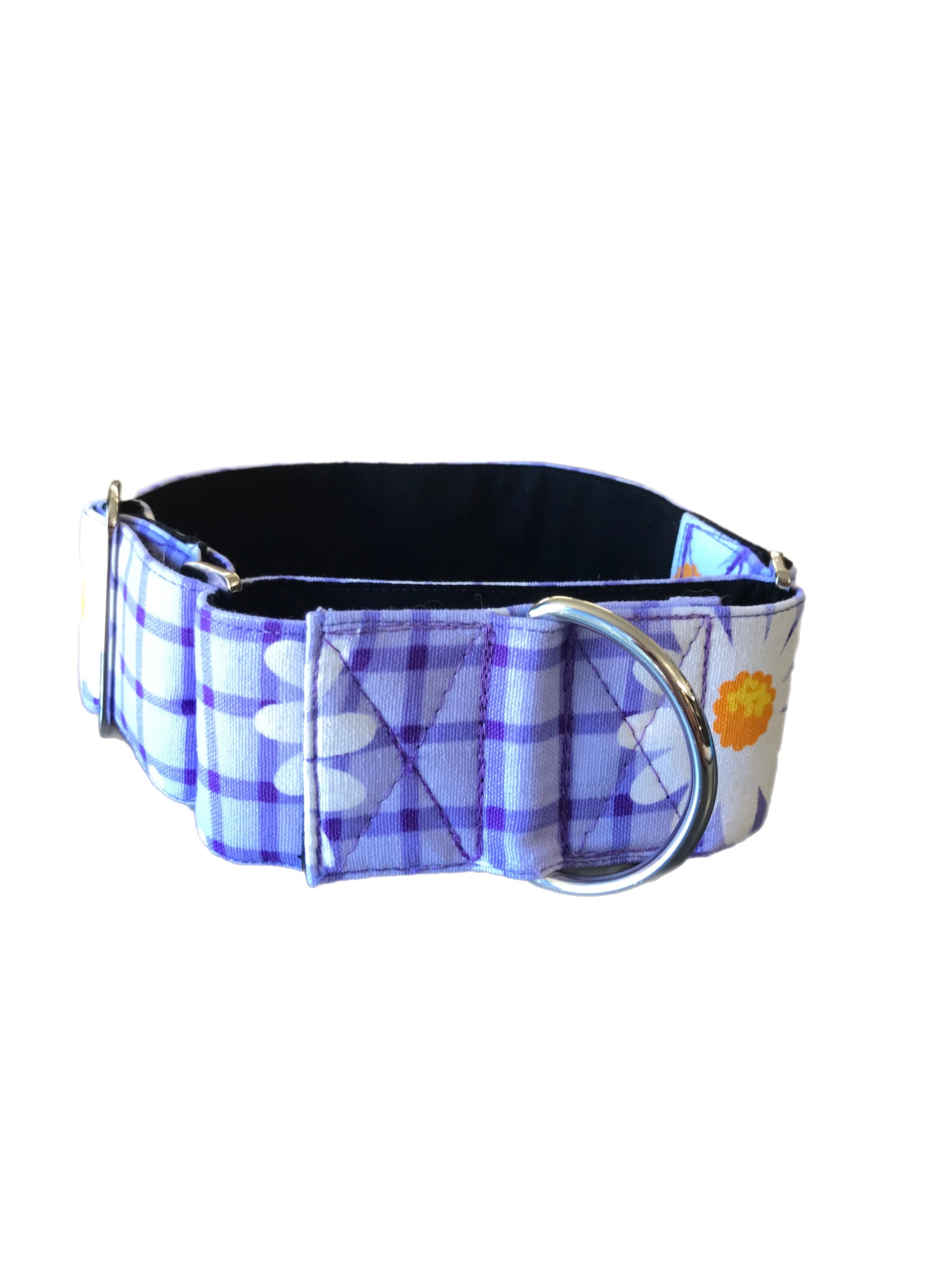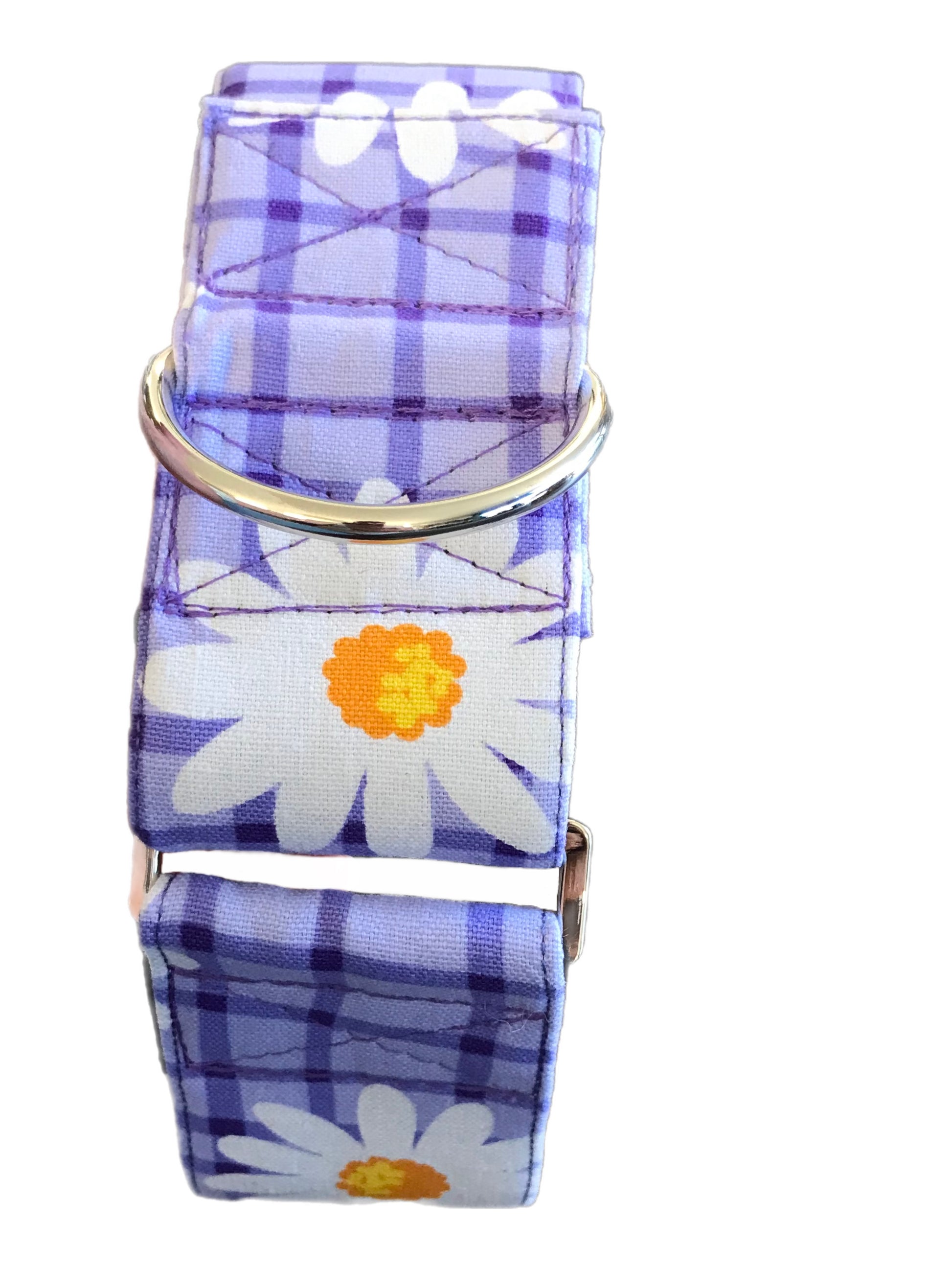 This cotton fabric is a happy and bright purple check design with daisies and the collar is matched with gunmetal hardware. However, if you would prefer black or gold hardware, please contact us before purchase to check if in stock