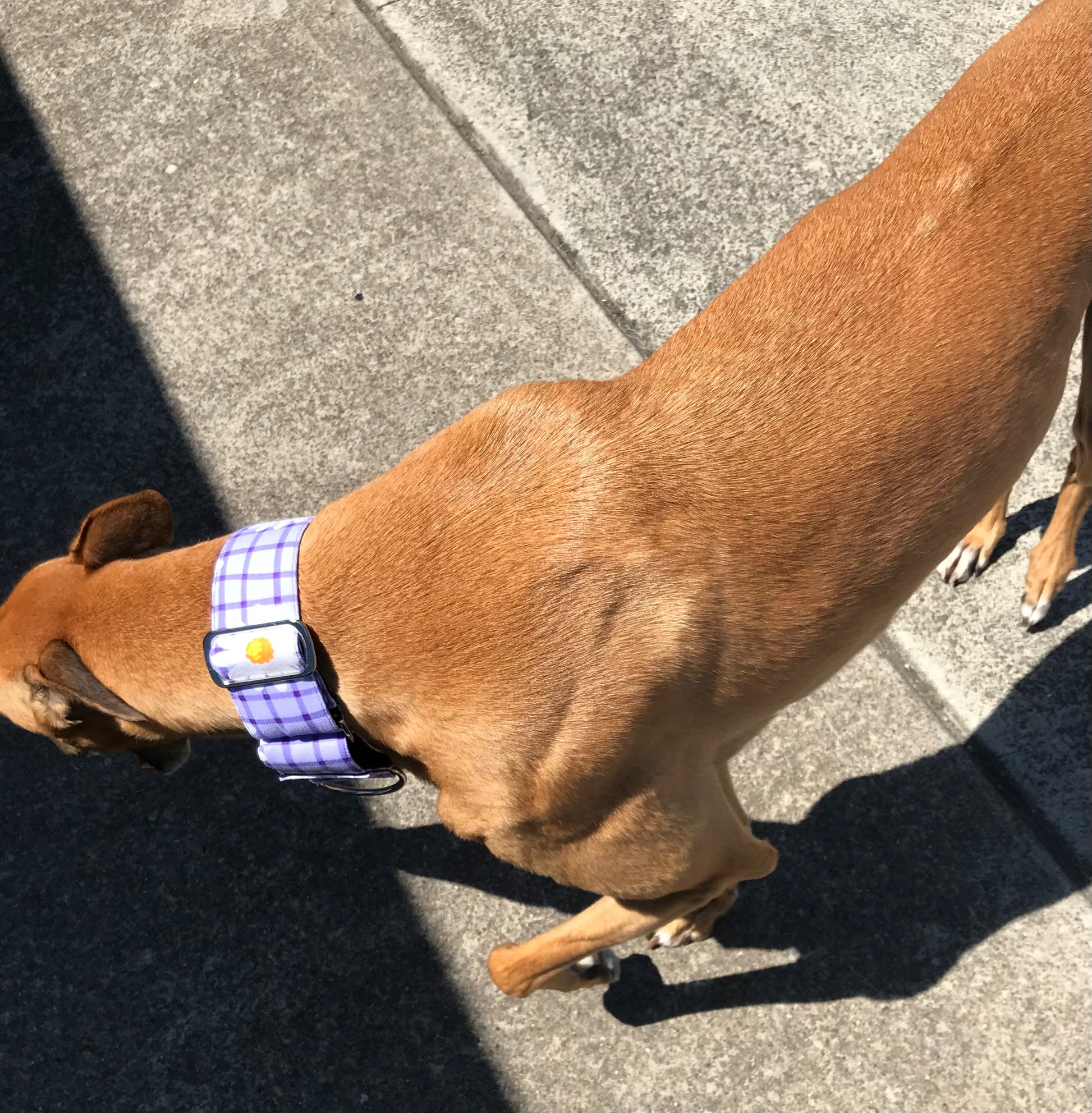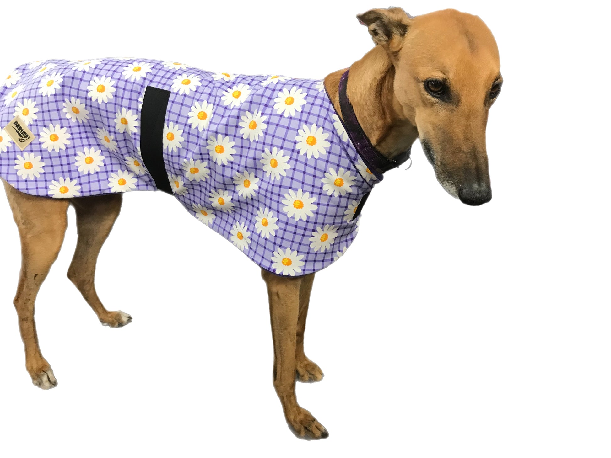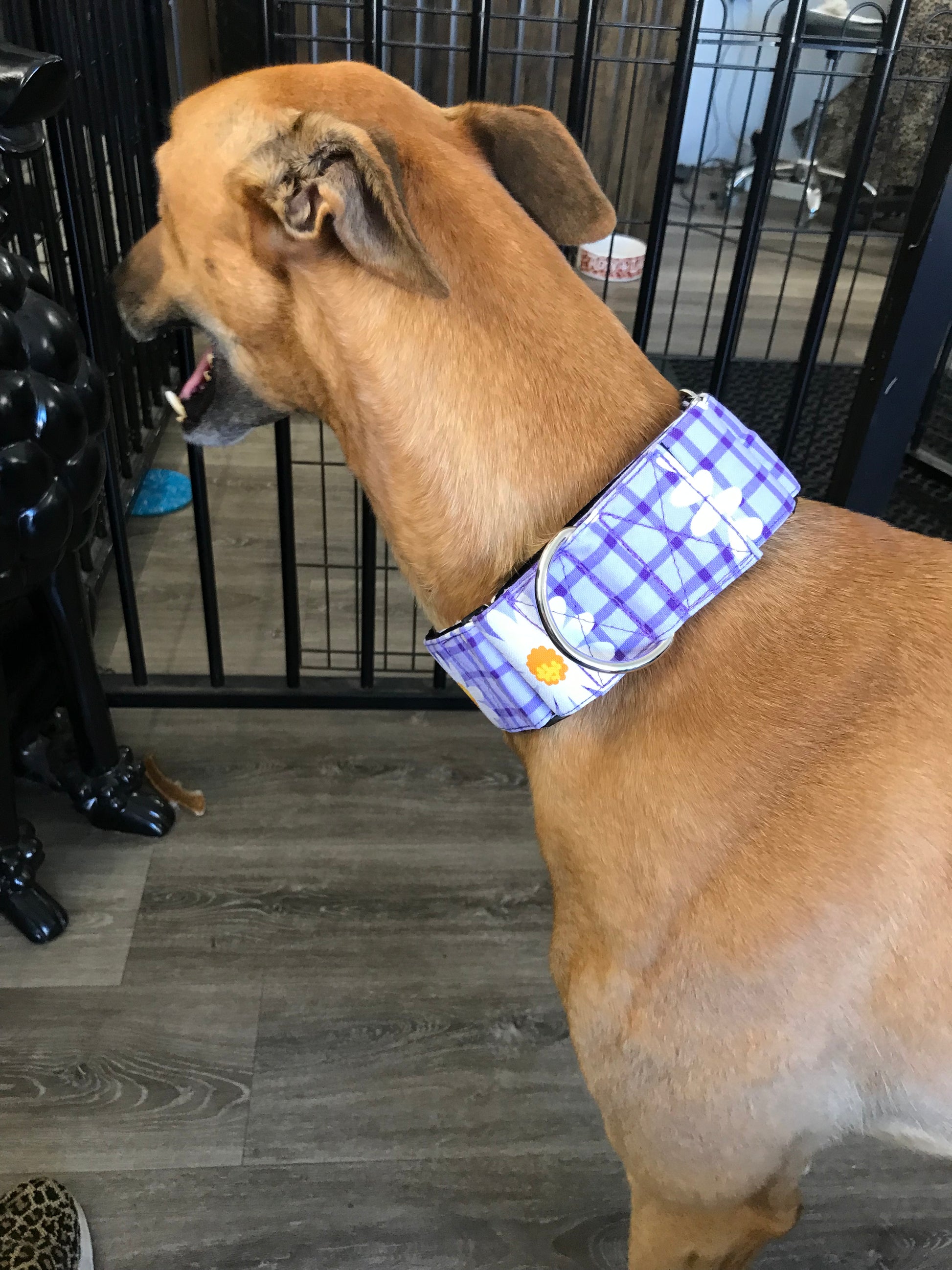 This cotton fabric is a happy and bright purple check design with daisies and the collar is matched with gunmetal hardware. However, if you would prefer black or gold hardware, please contact us before purchase to check if in stock