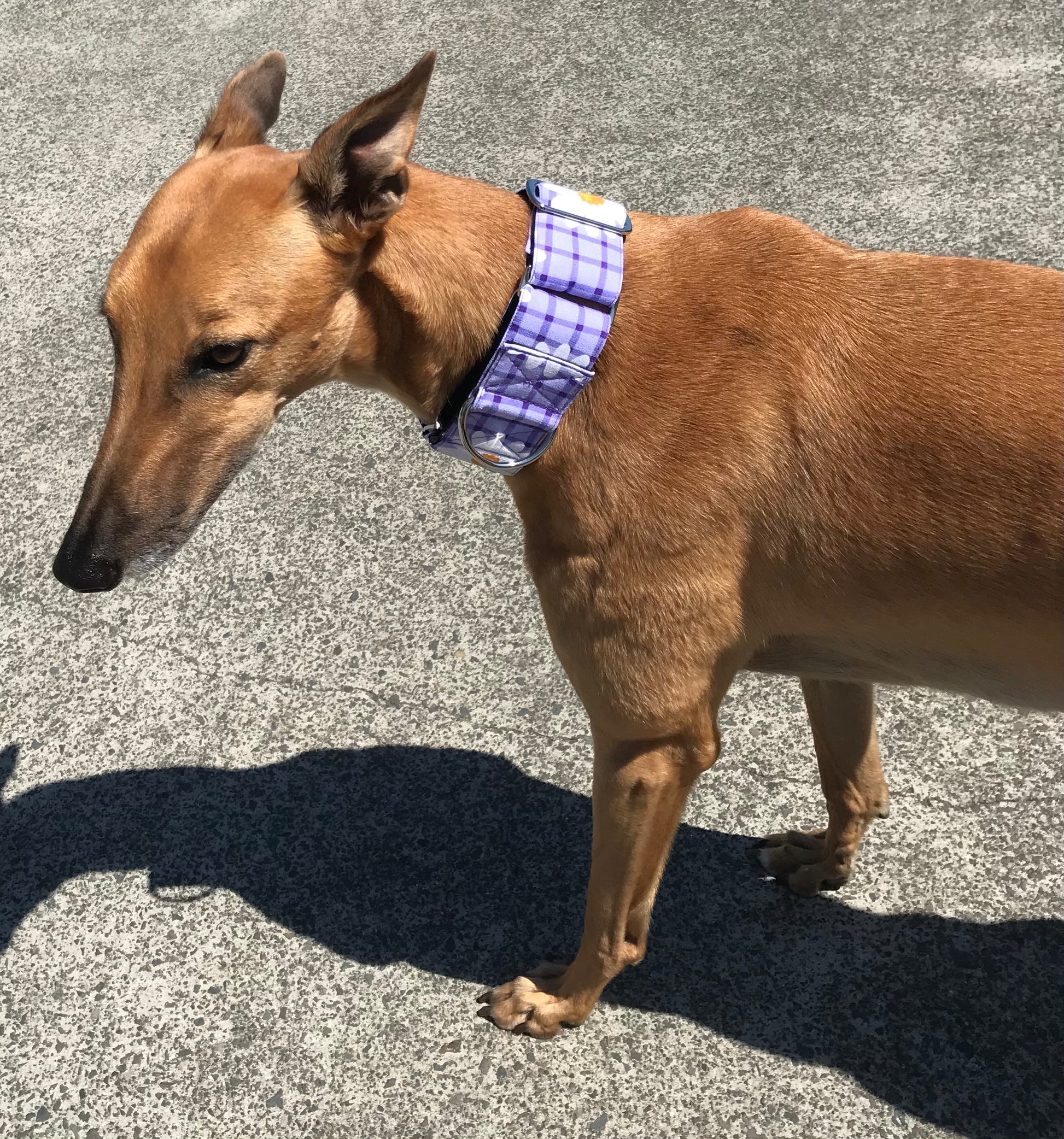 Martingale collars are commonly worn by Greyhounds because they are less likely to slip off due to their heads being more narrow than their necks.