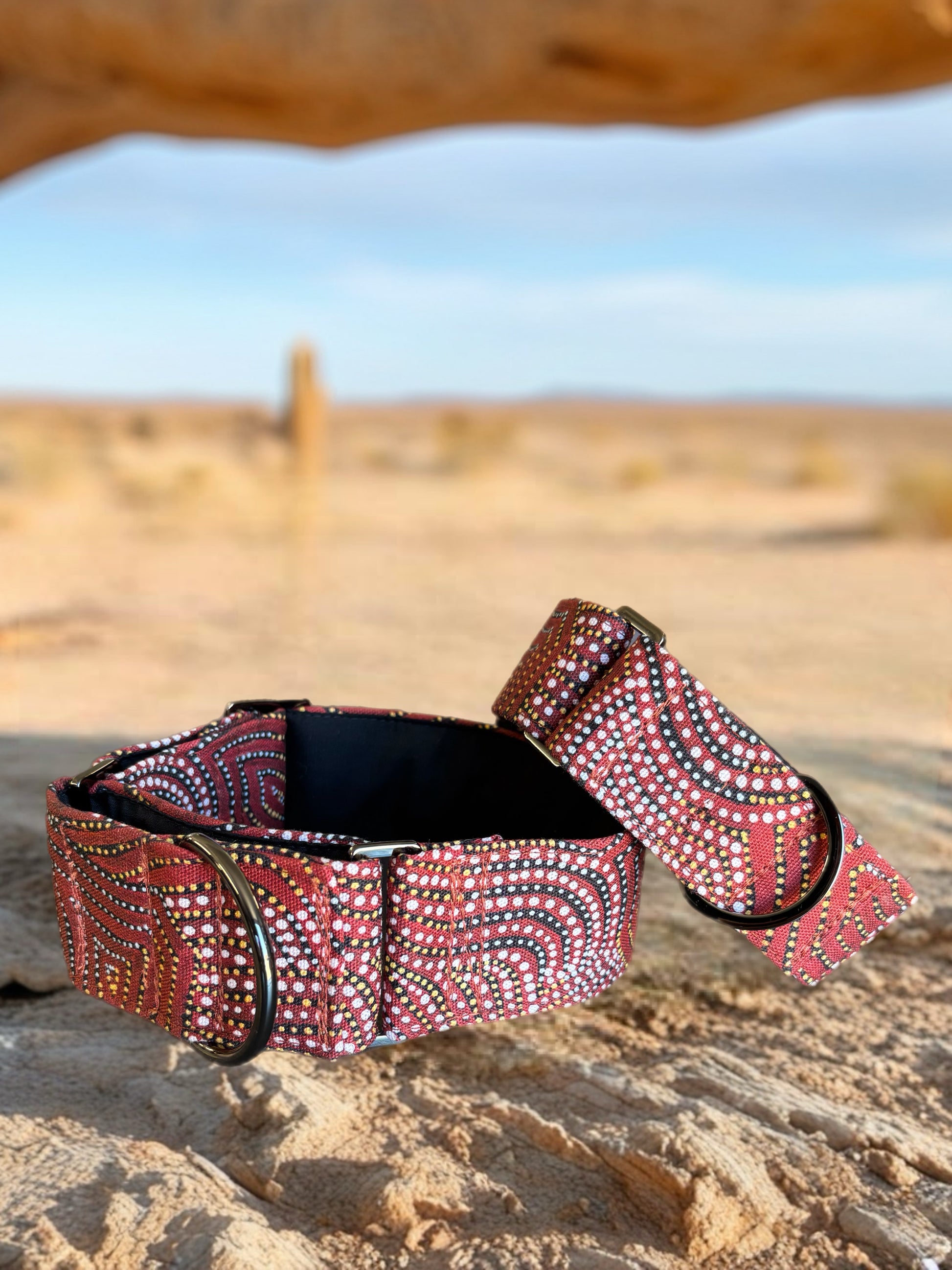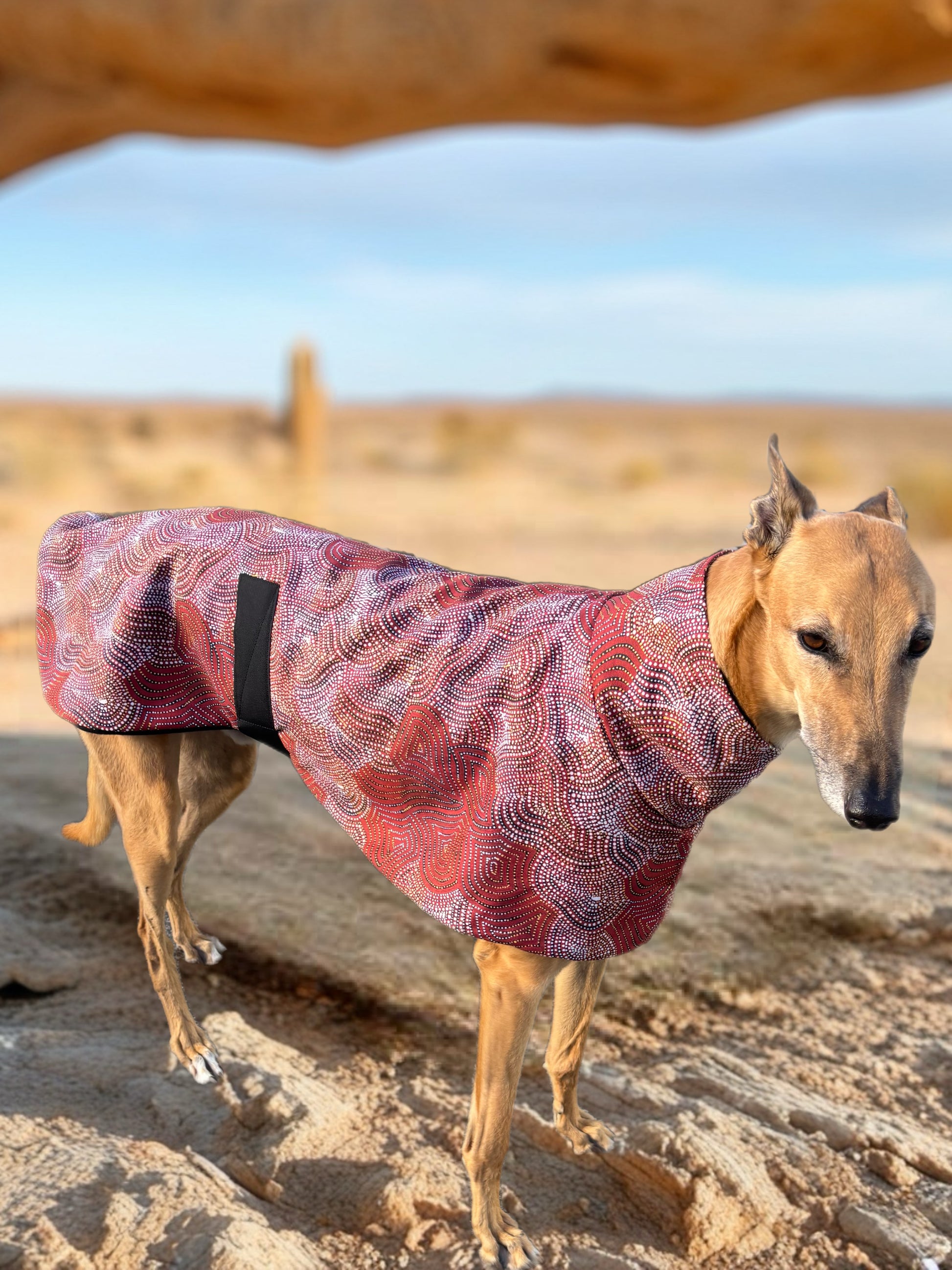A striking fusion of art and function, this greyhound coat features a rich, earthy red palette adorned with intricate dot-inspired patterns that echo the beauty of the Australian landscape. Designed to contour the elegant lines of your hound, it offers a sleek, tailored fit while allowing full freedom of movement.