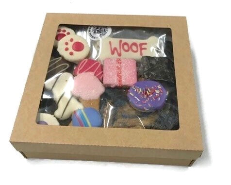 This box contains approximately 400g of doggo delights. Some designs might vary but colors will be the same. Images are of the pack contents