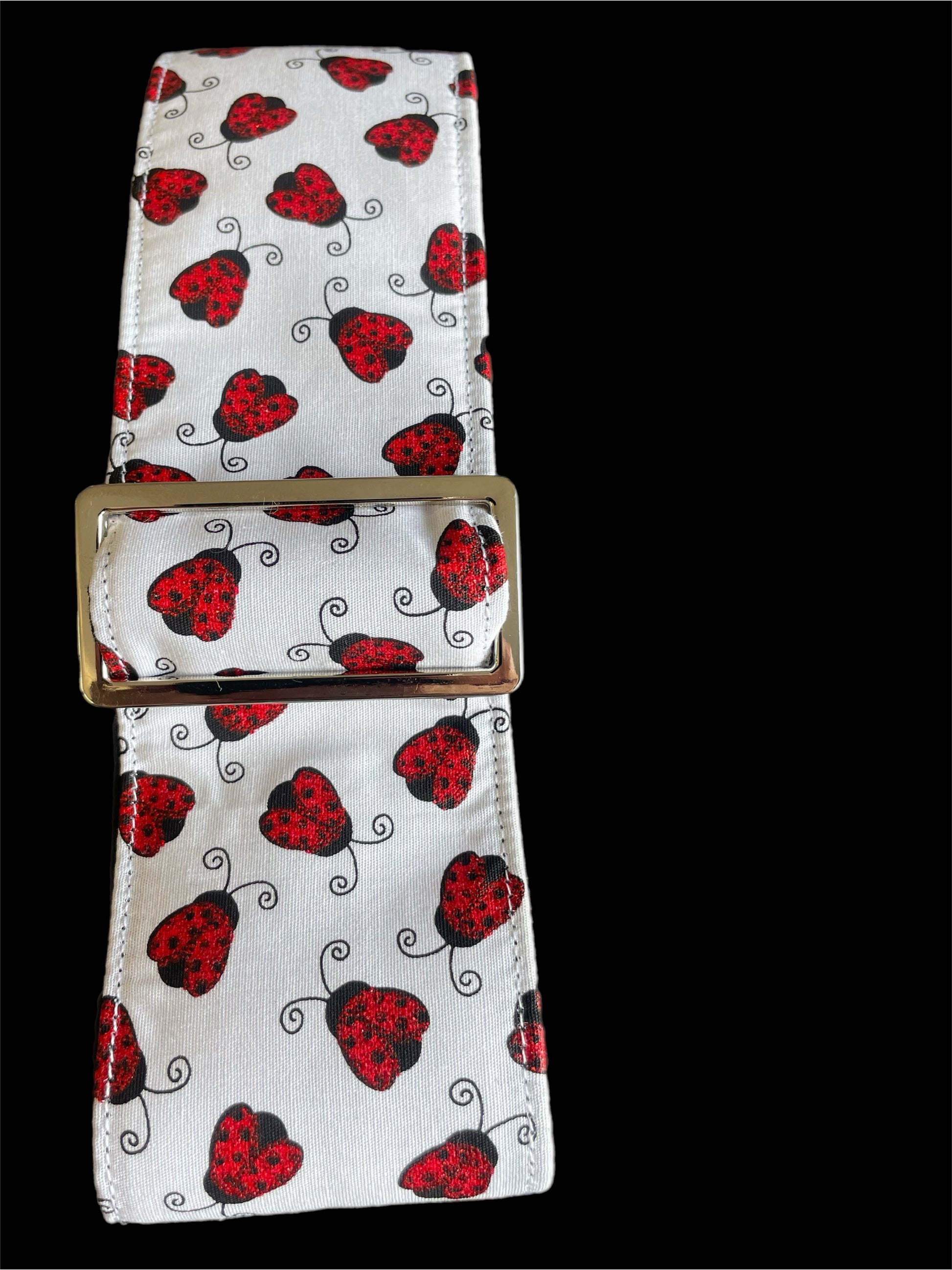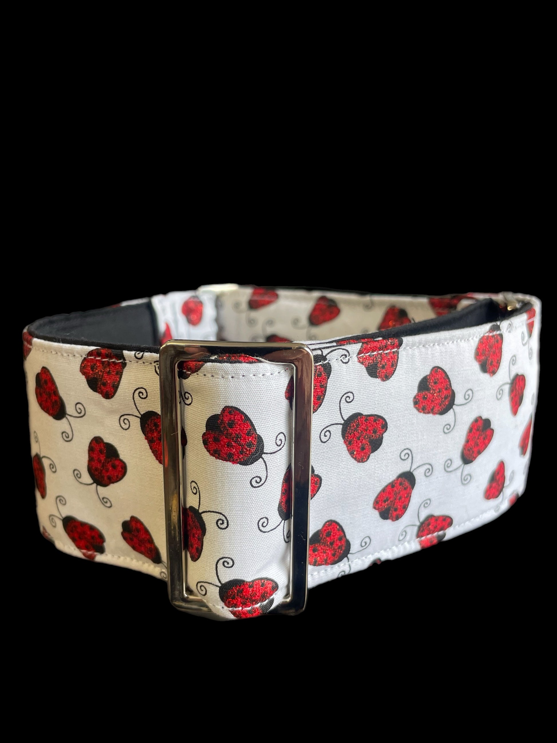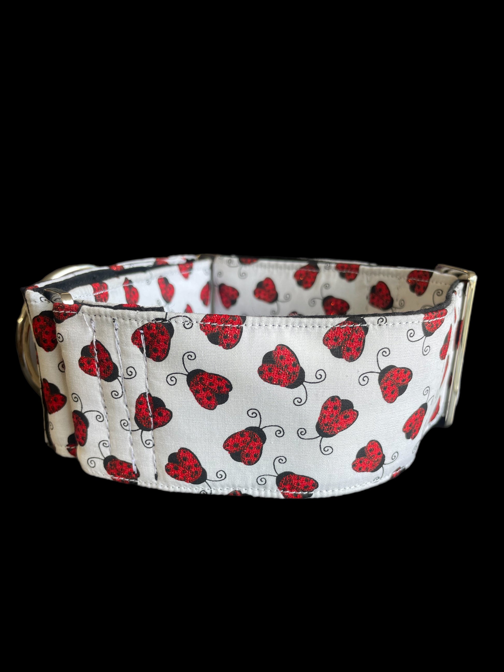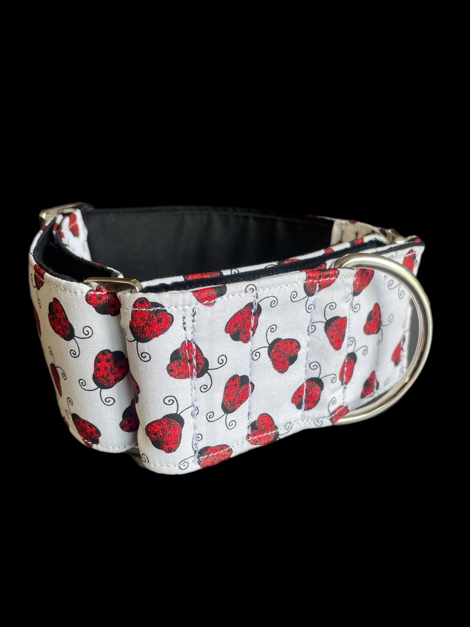 Red Shimmery ladybirds design on crisp white greyhound whippet wide Martingale collar cotton covered super soft