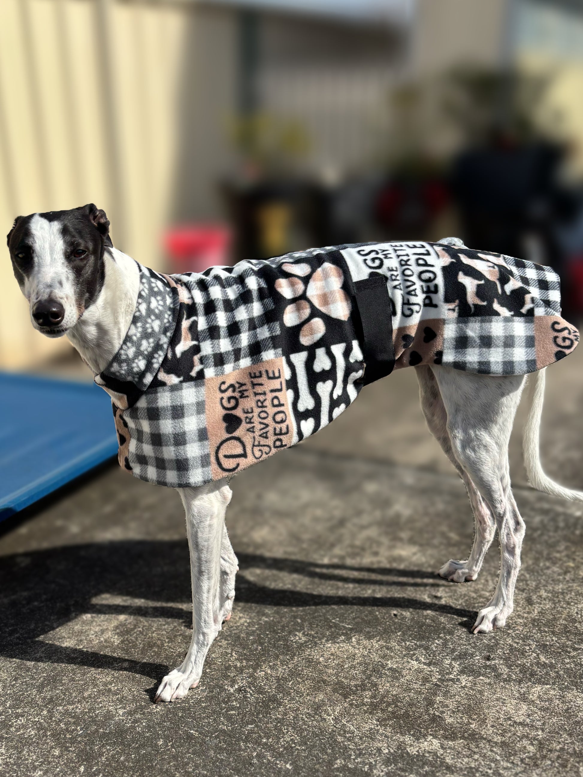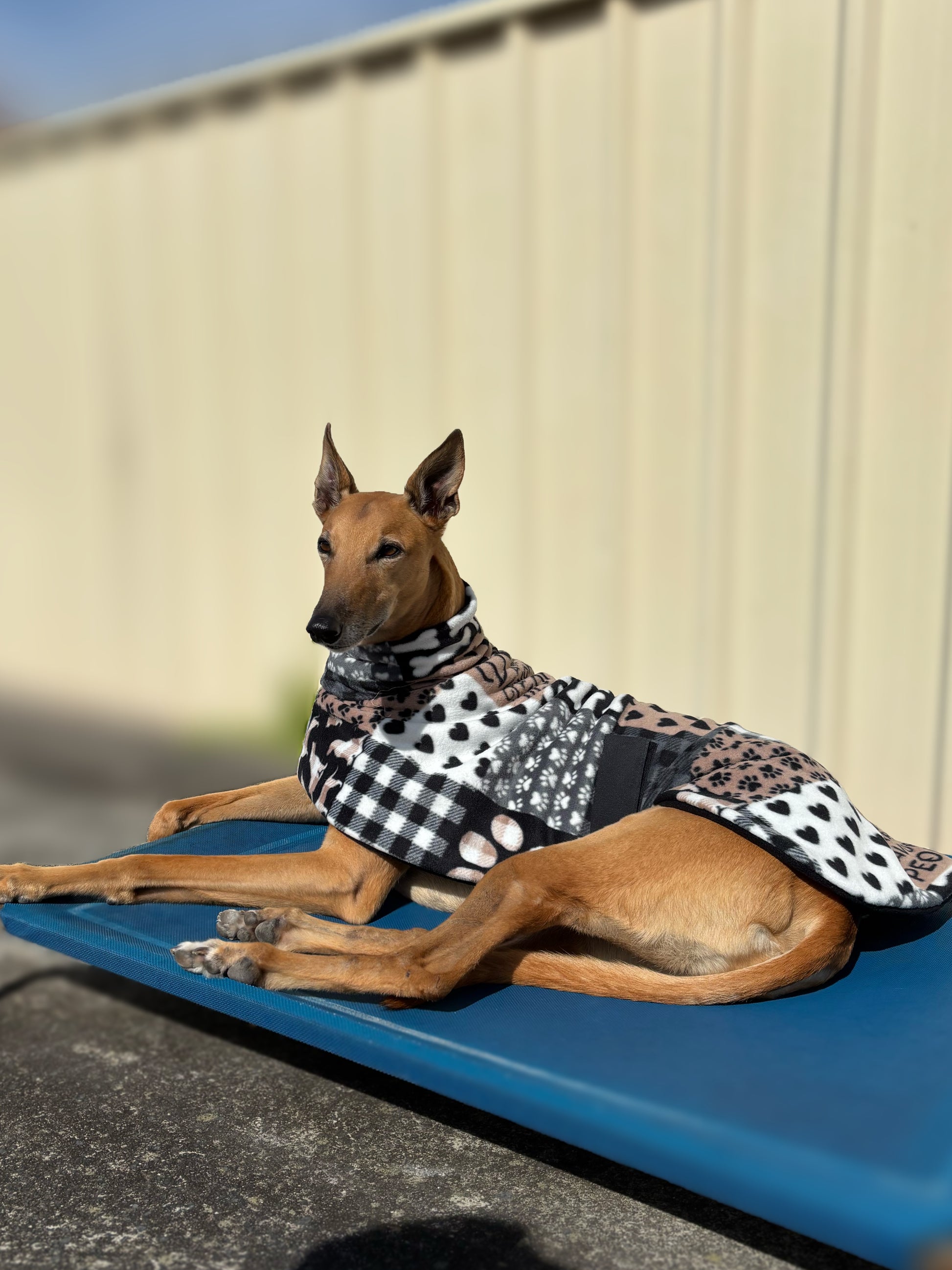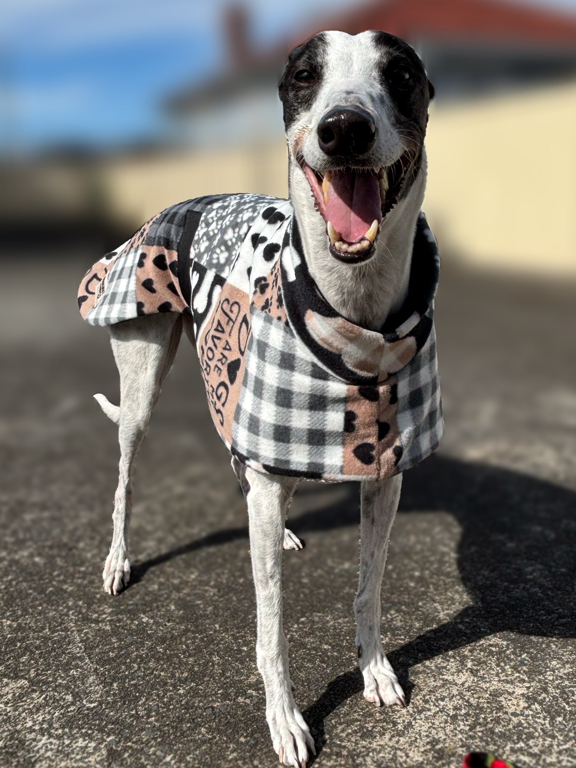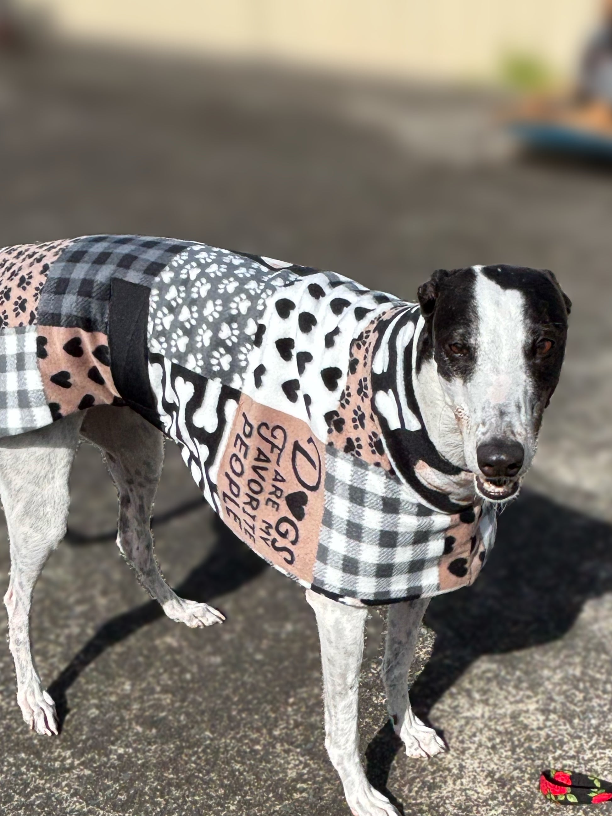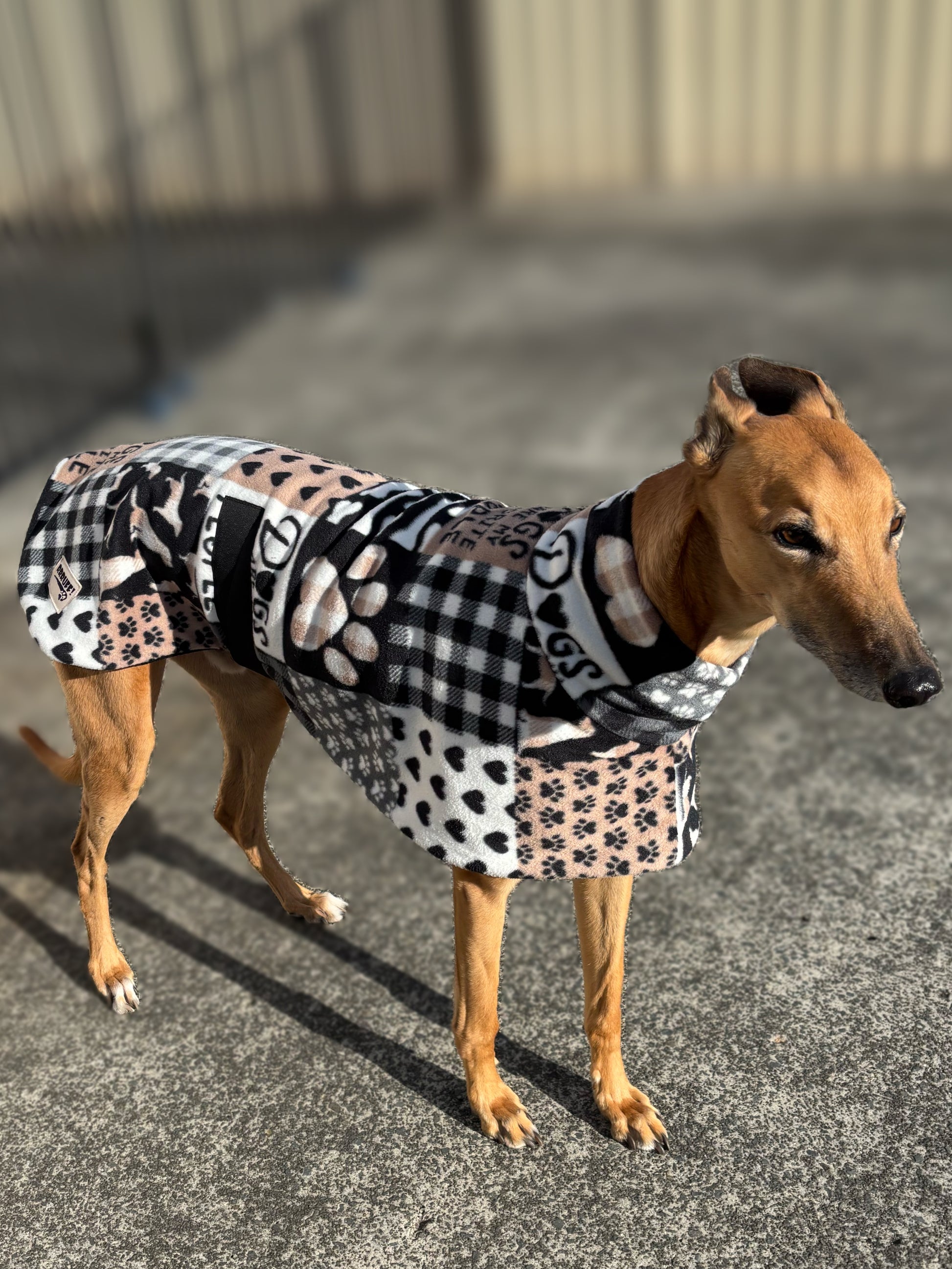 This coat features a fun and eye-catching patchwork-style fabric design that celebrates the love of dogs. The fleece showcases a mix of patterns, including bold paw prints, playful silhouettes. The design is balanced with traditional black-and-white checks and soft beige accents, giving it a cozy yet stylish look. Perfect for dog lovers, this fabric combines warmth, comfort, and personality, making it a standout choice for keeping your greyhound snug while showing off their unique charm.