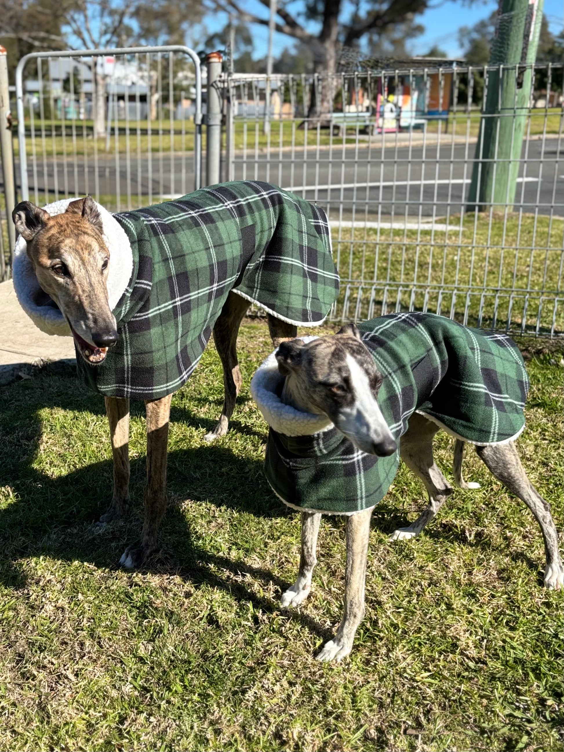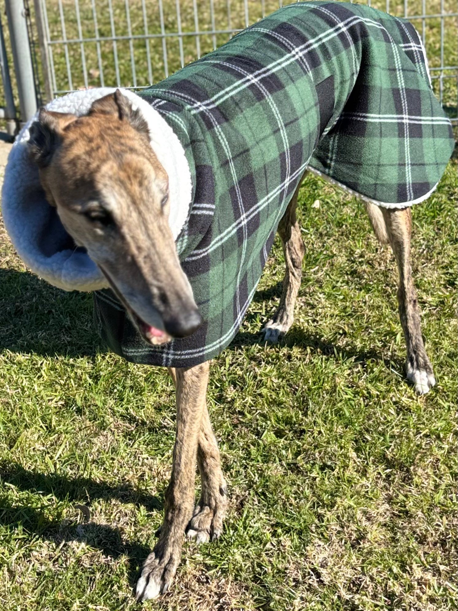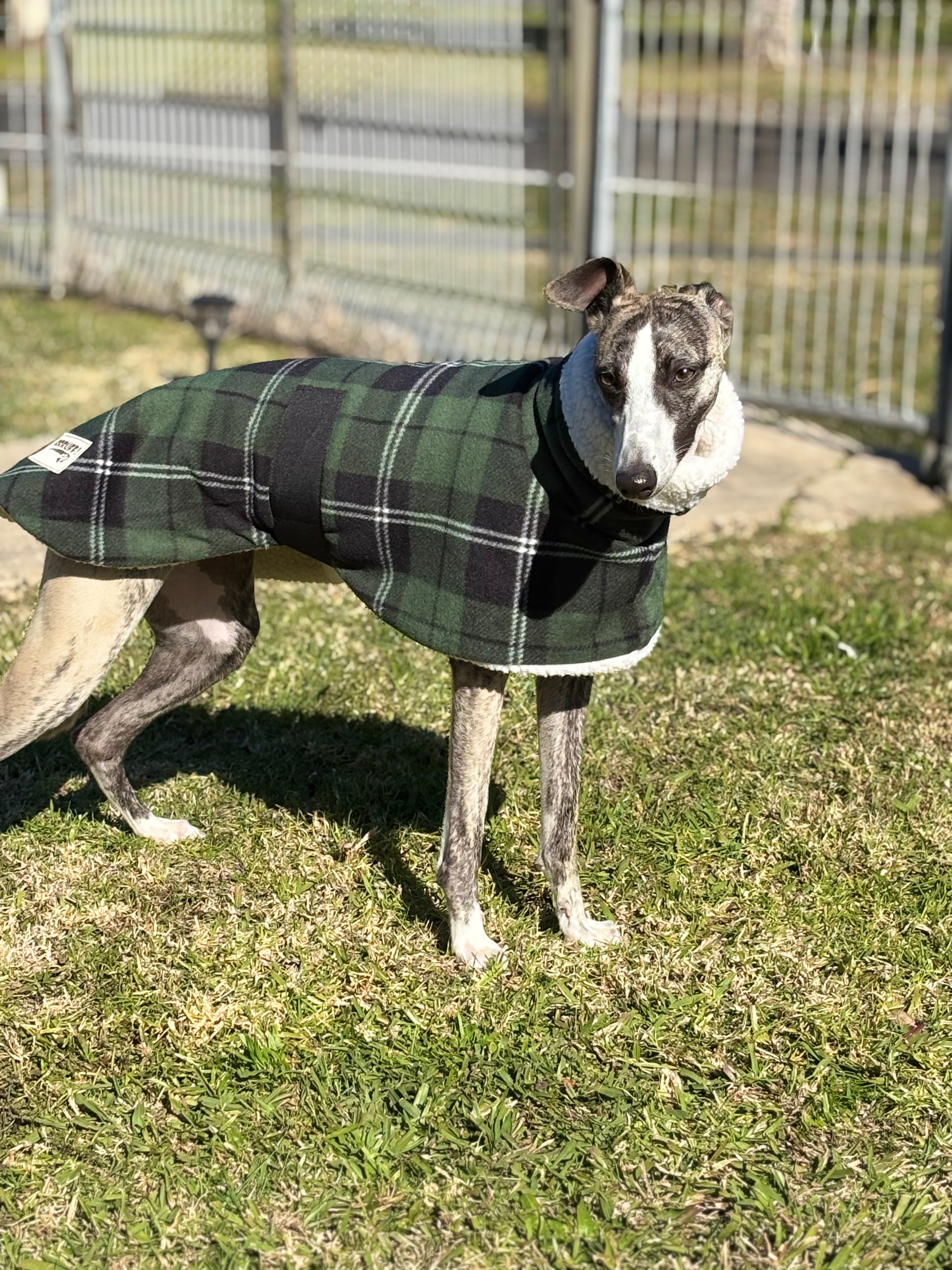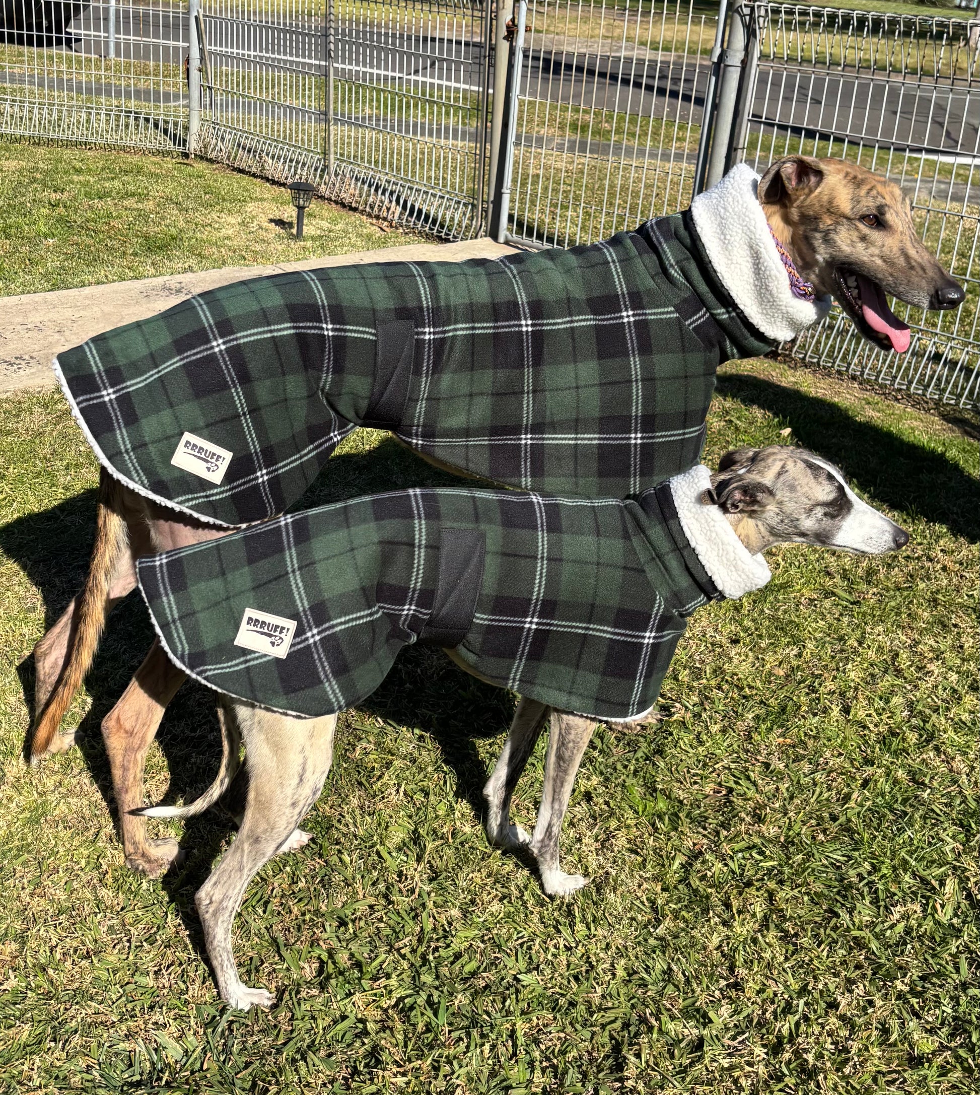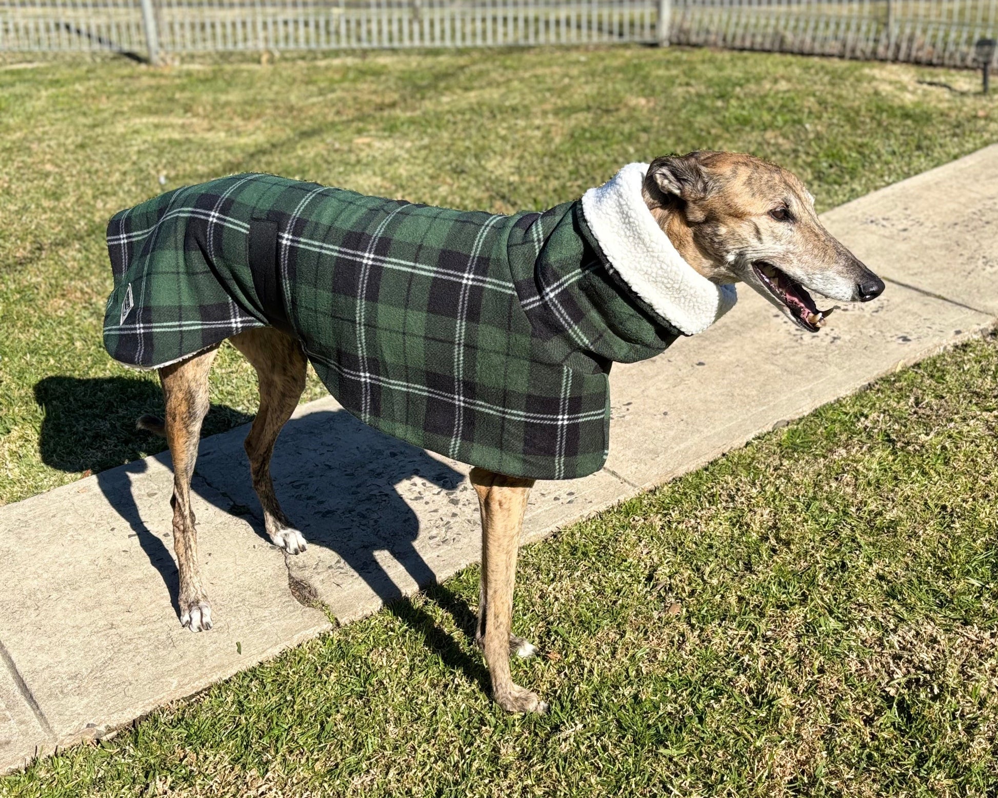 Green Lumberjack Greyhound coat in deluxe style rug tartan check polar fleece washable extra wide neck.