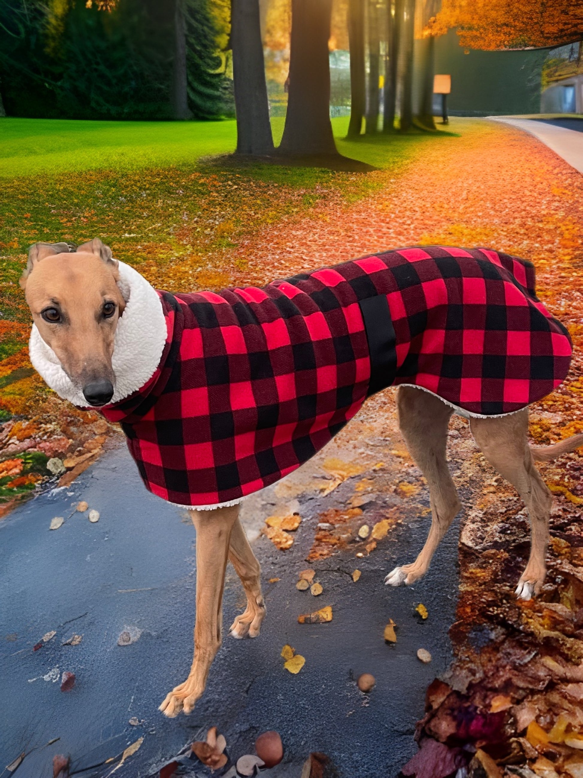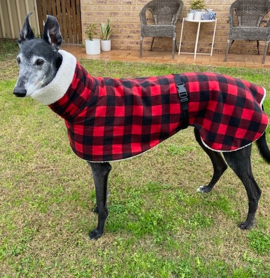 The red Lumberjack Greyhound coat in deluxe style rug red black tartan check polar fleece washable extra wide neck