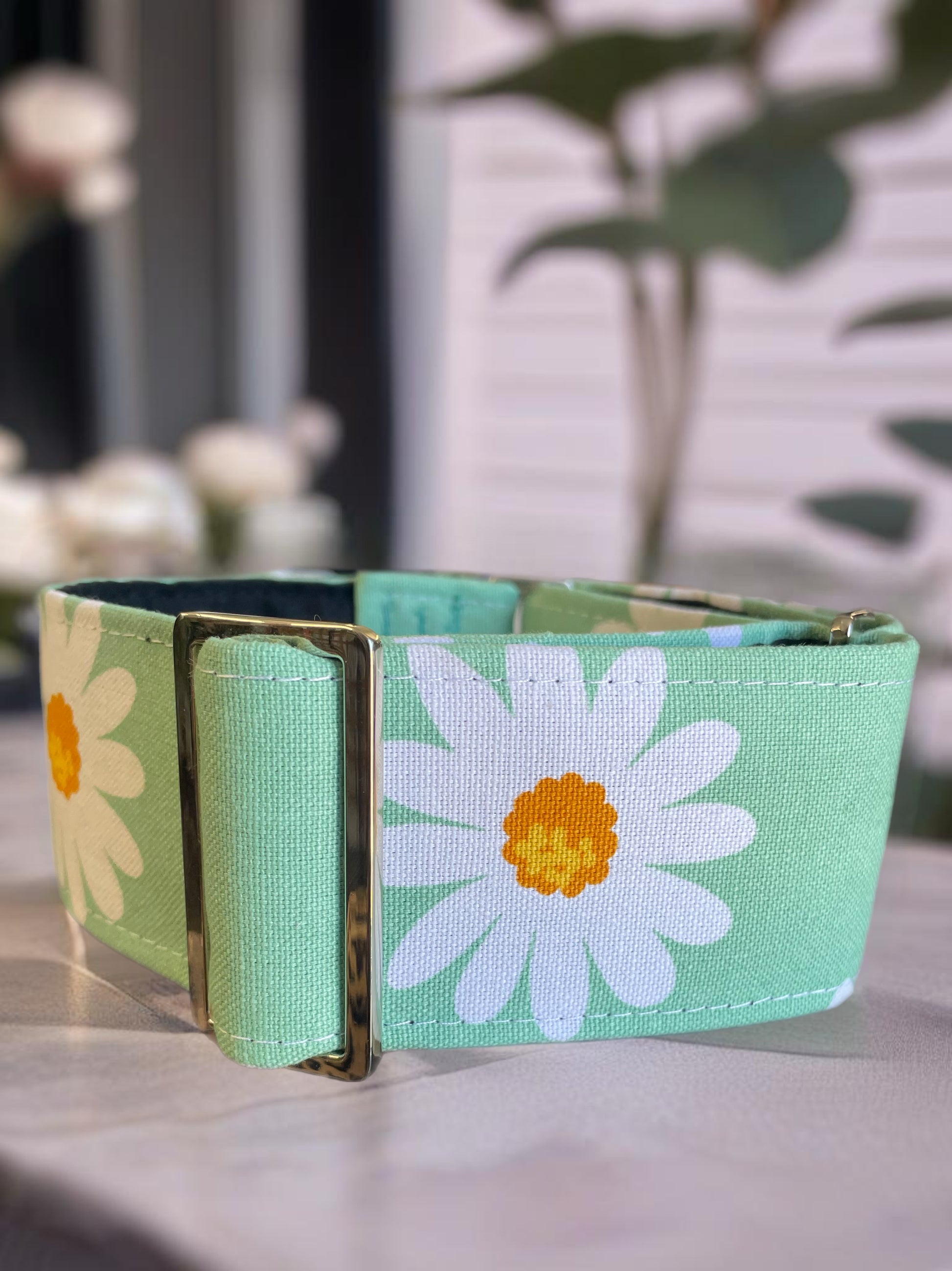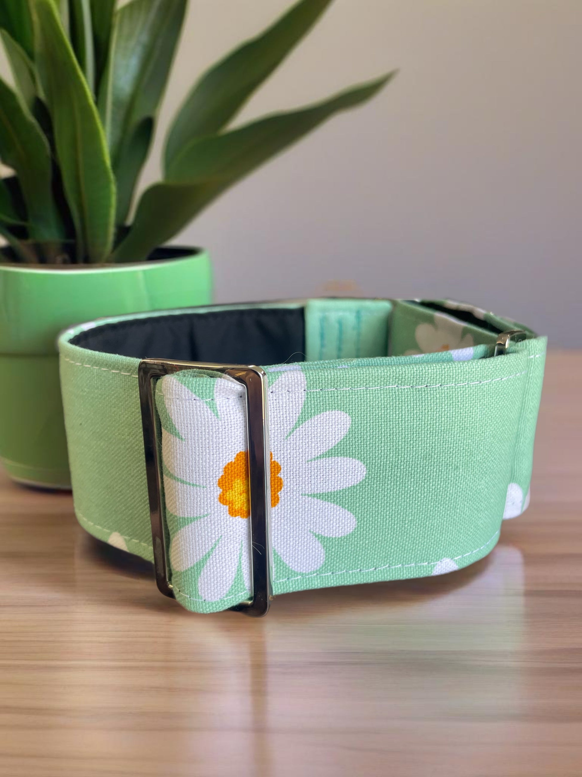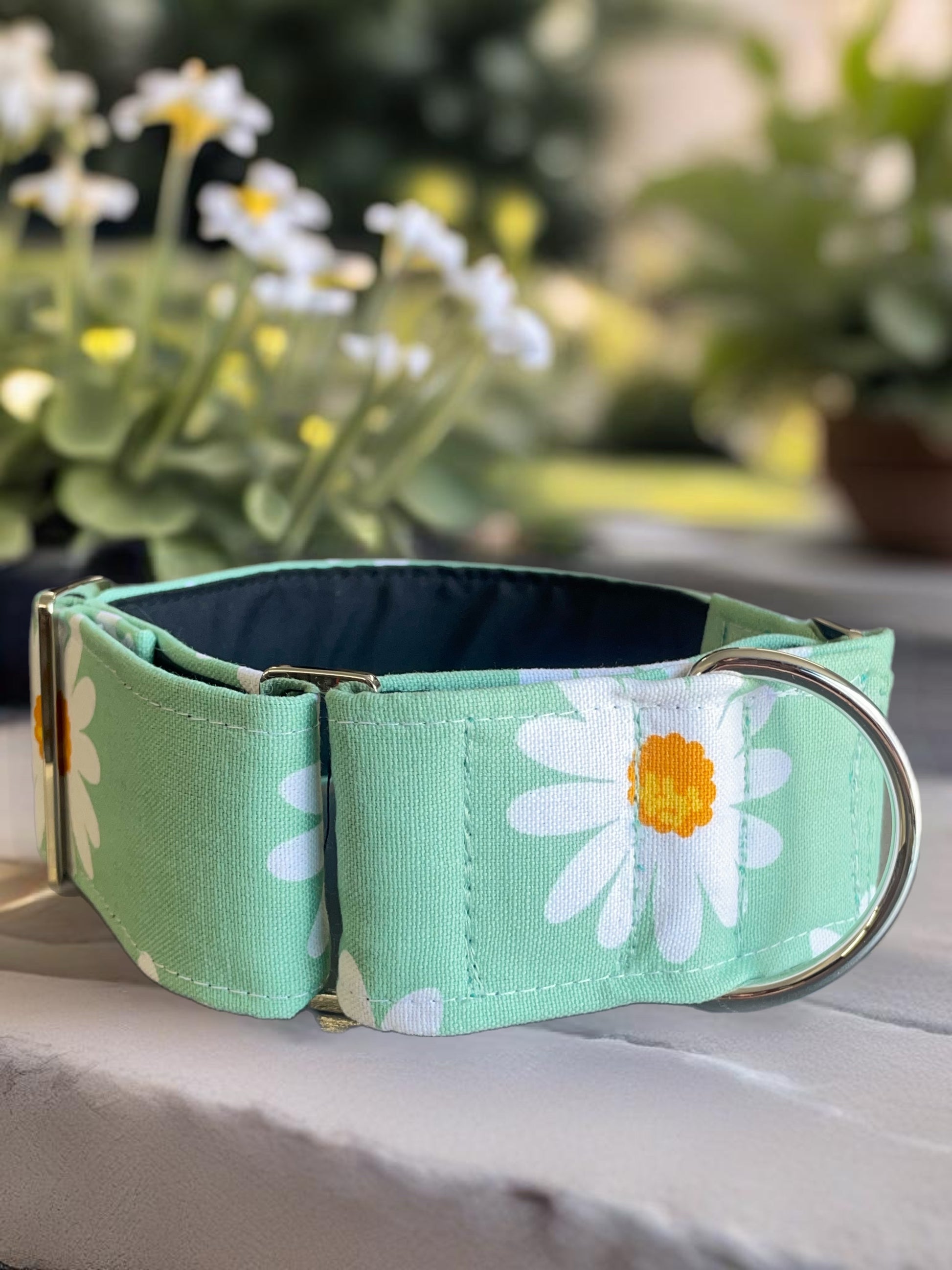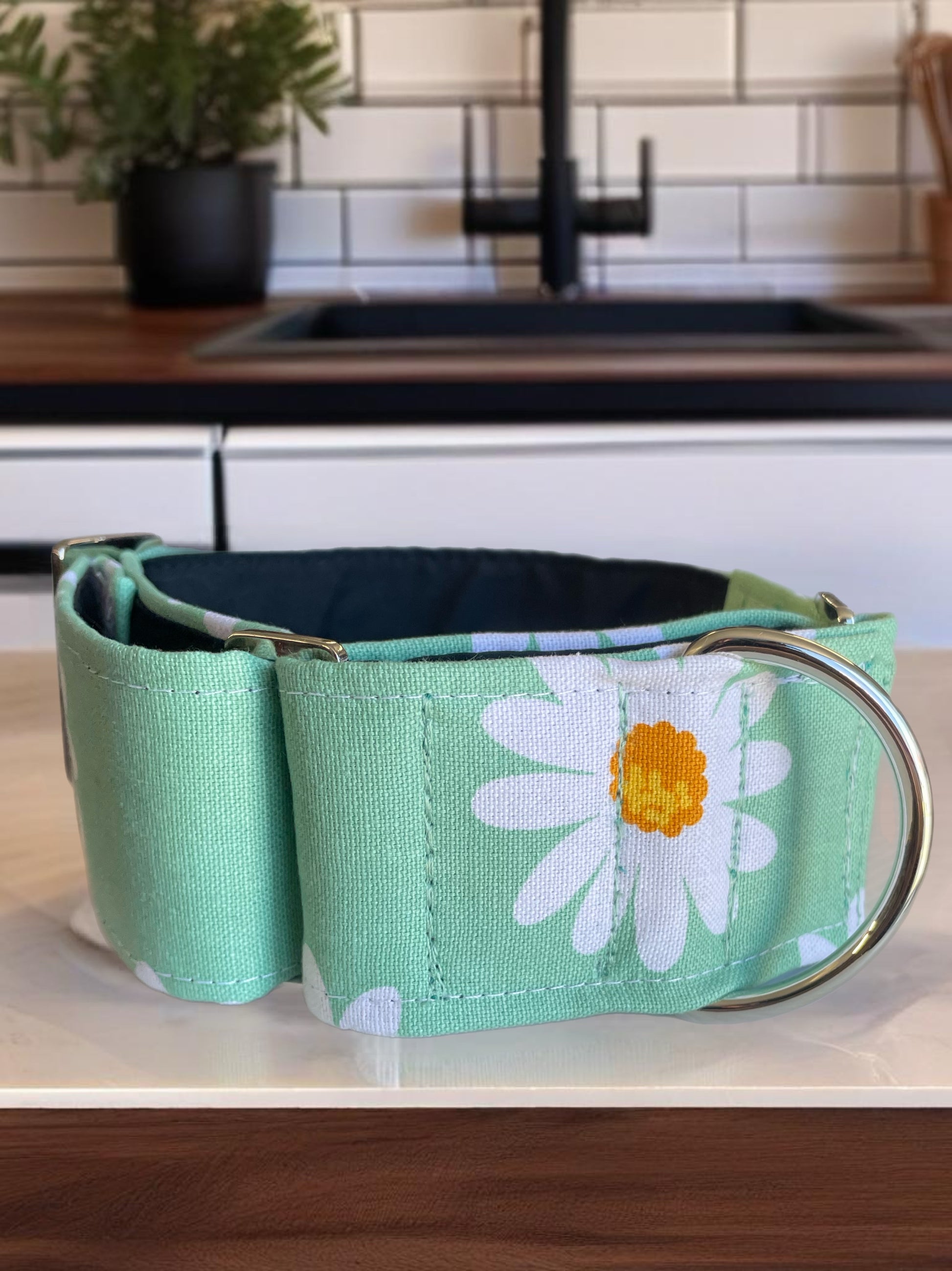 Wide Martingale collar daisies on sage sturdy cotton 50mm width
